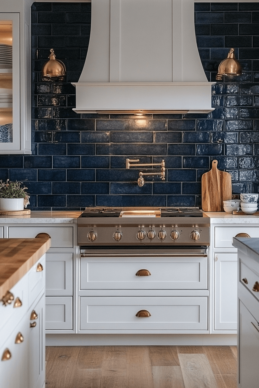 ❌ Avoid This: Avoid pairing navy backsplashes with dark wood cabinets—the combination can read heavy and dated rather than fresh and nautical.