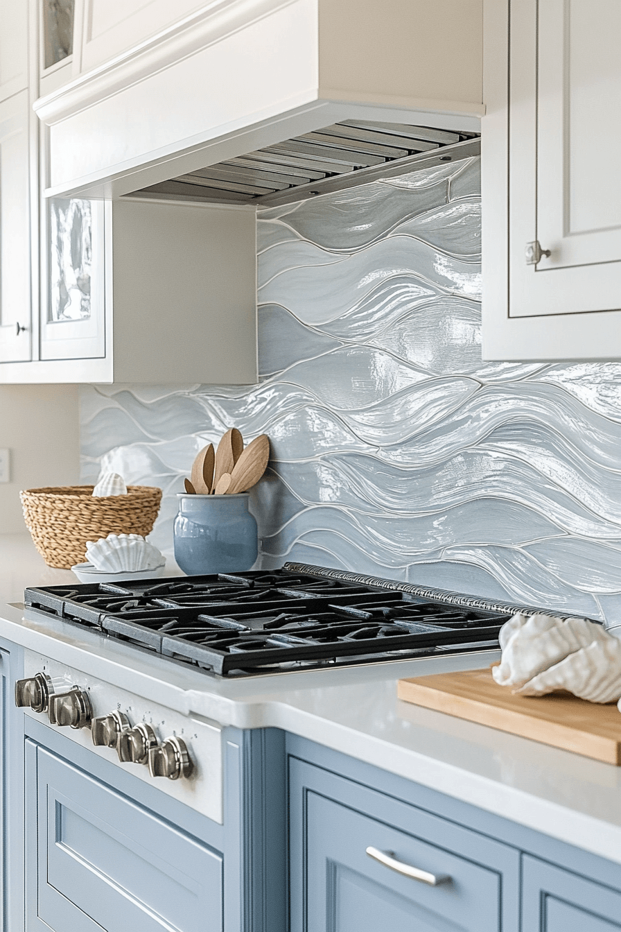 Wavy tile designs bring ocean rhythm to the kitchen wall, offering sculptural coastal kitchen backsplash ideas that feel elegant and modern. Soft aqua or misty gray tones reinforce the coastal influence. Texture adds depth without becoming literal. The backsplash feels fluid and calming. Movement enhances the space subtly. Explore coastal kitchen backsplash ideas with gentle wave patterns.