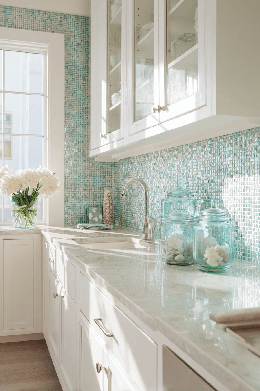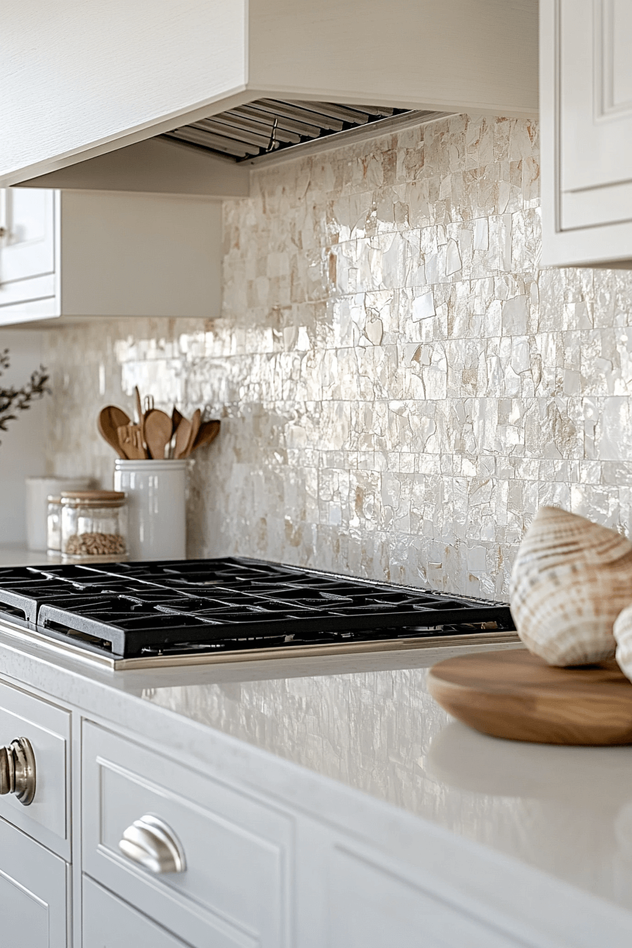Pearl-inspired tiles introduce soft iridescence, making them a luxurious yet subtle option among refined coastal kitchen backsplash ideas. Their shell-like glow enhances brightness while maintaining an understated elegance. Paired with matte counters or polished fixtures, the look feels breezy and elevated. Light reflects gently without glare. The kitchen takes on a beach-chic sophistication. Discover coastal kitchen backsplash ideas inspired by ocean treasures.