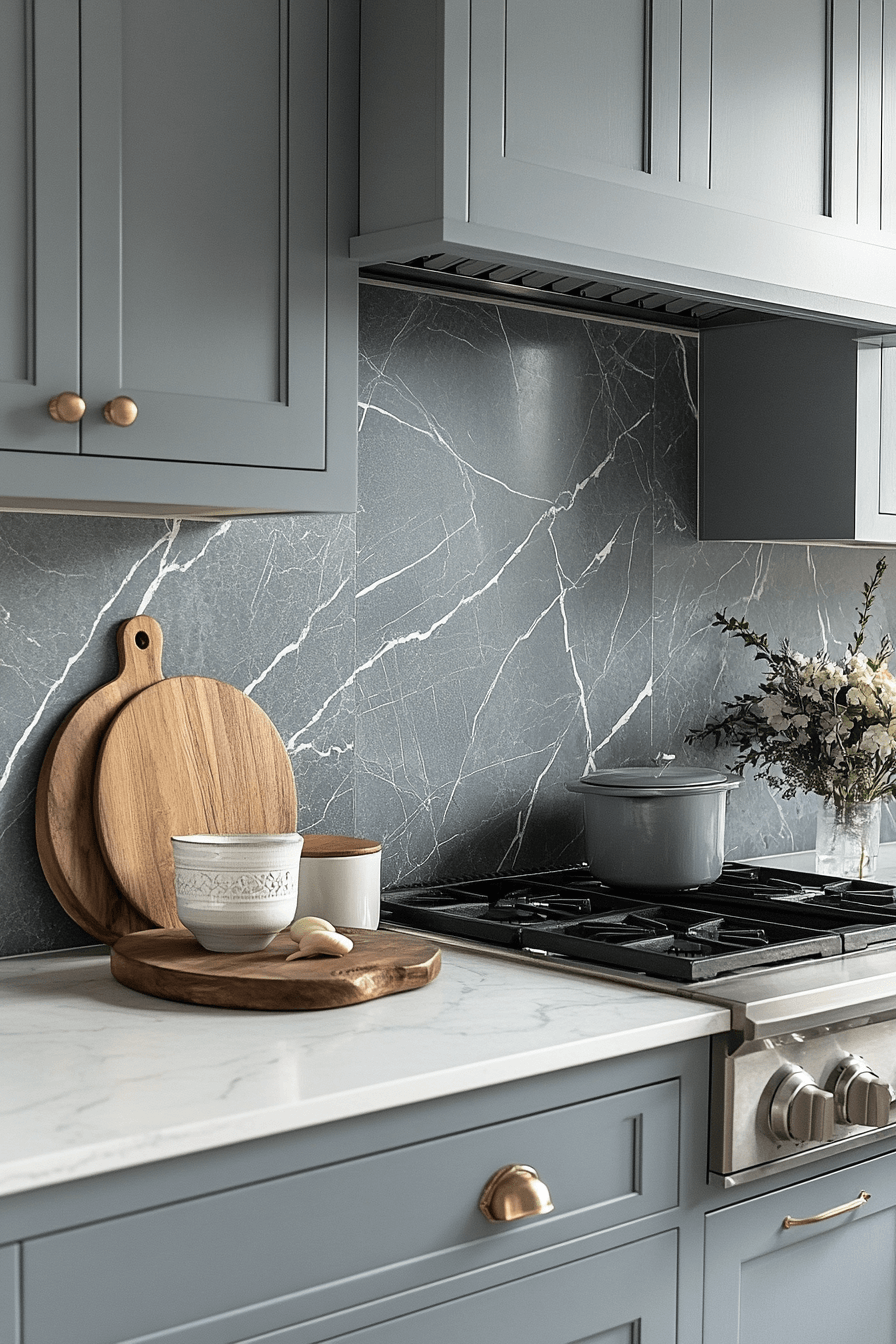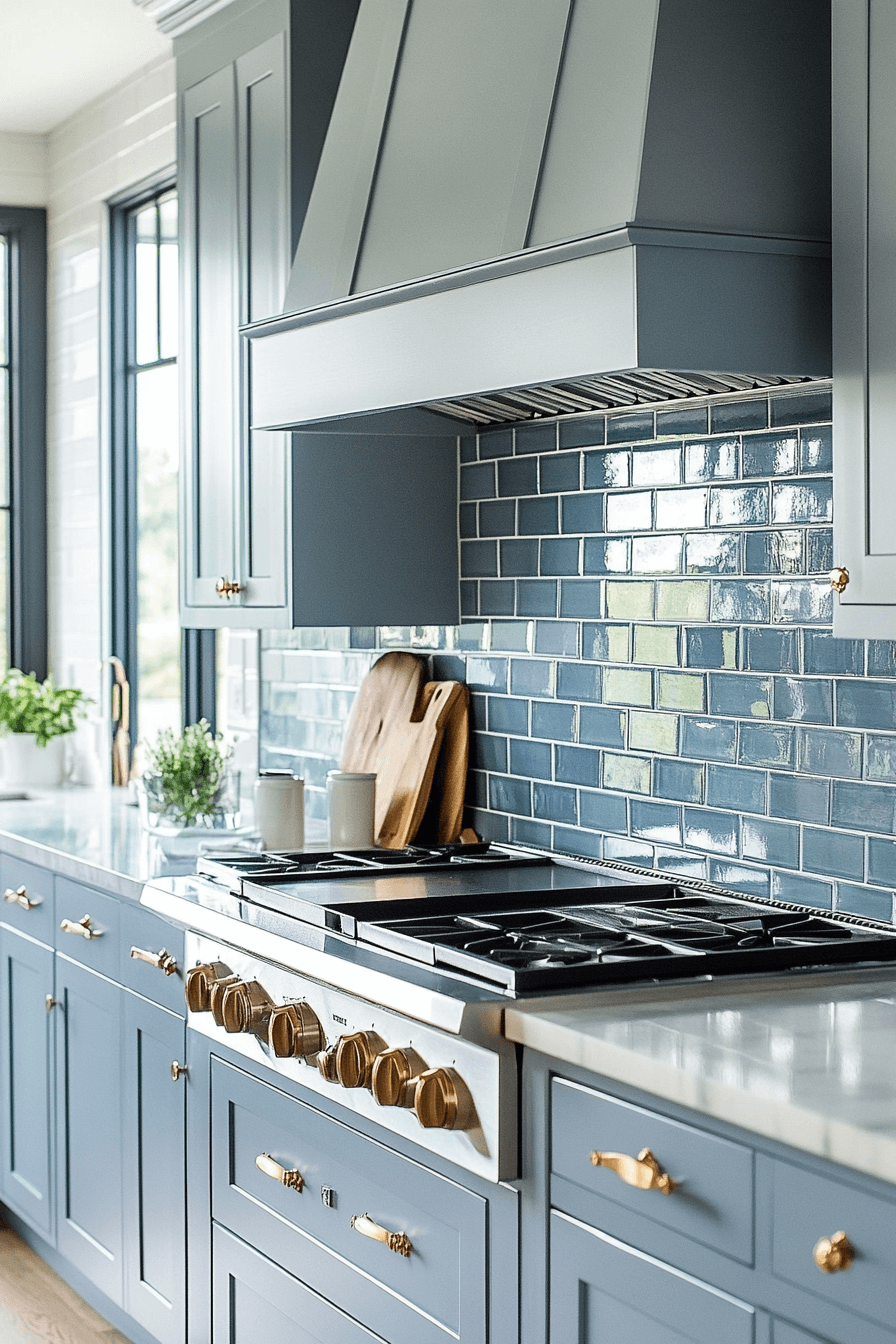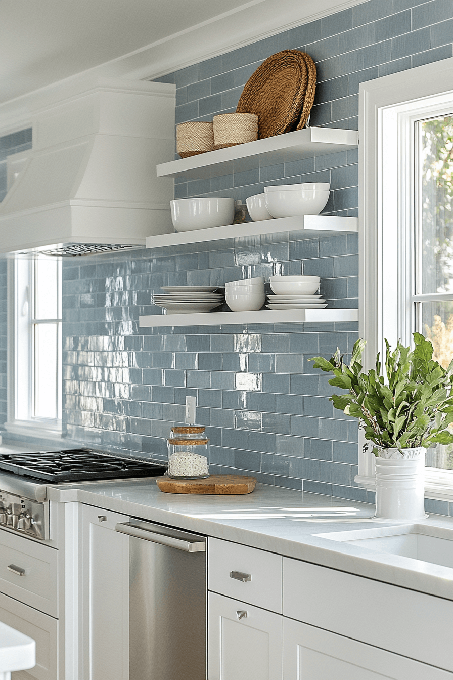 Misty gray and pale blue tiles create a fog-like softness, making them ideal coastal kitchen backsplash ideas for minimalist interiors. The subtle color adds atmosphere without distraction. Scandinavian influences pair especially well with this palette. Calm becomes the dominant feeling. The look remains modern and light. Discover coastal kitchen backsplash ideas with quiet coastal tones.
