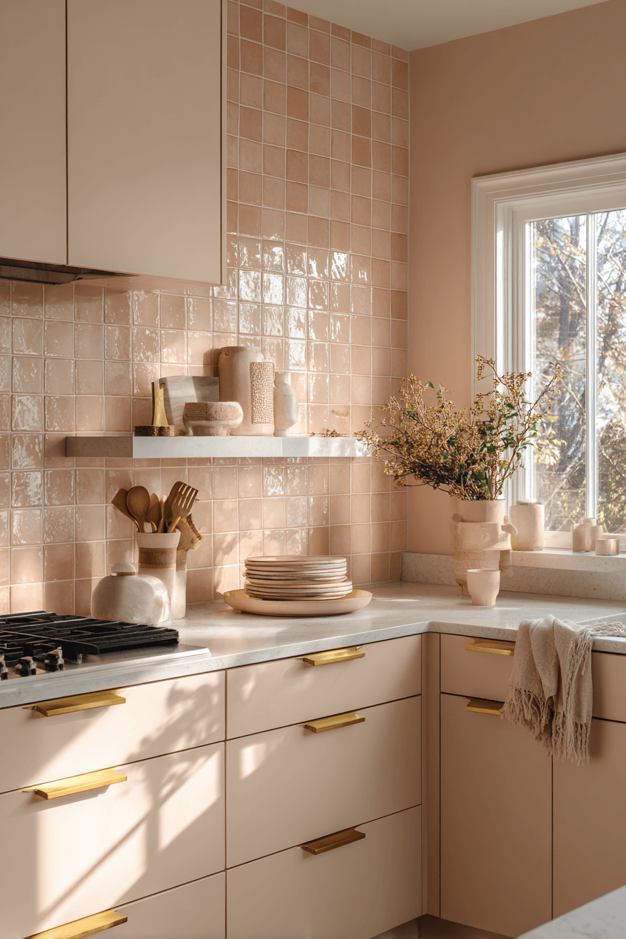 🔥 Avoid This: Avoid pairing blush tiles with stark white cabinets or cool gray tones, which clash with the warm undertones and kill the sunset-inspired romance this look depends on.