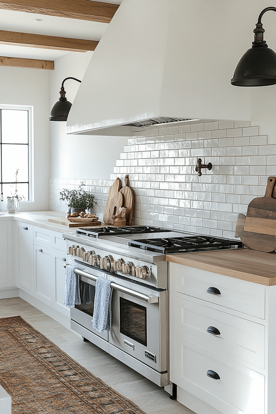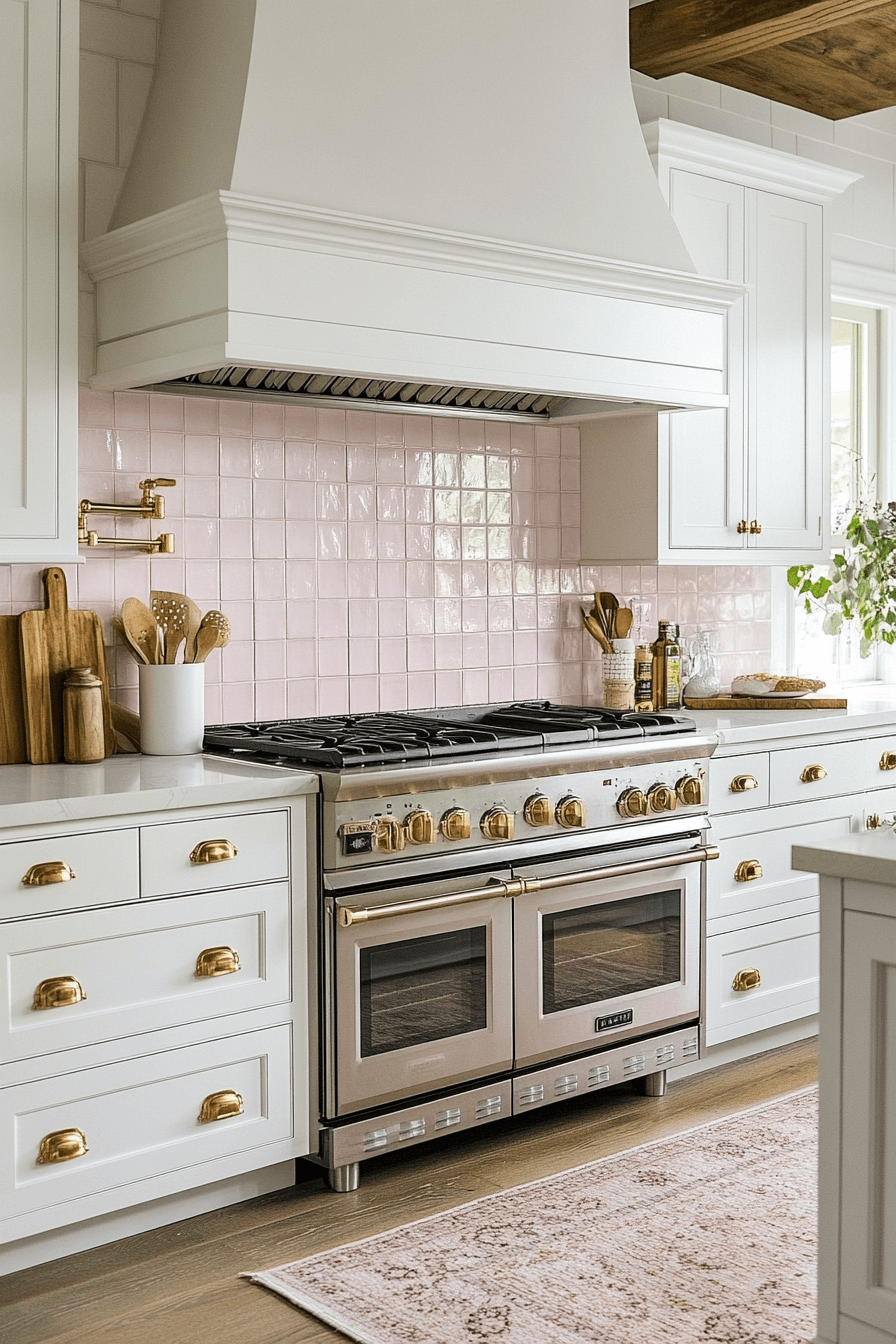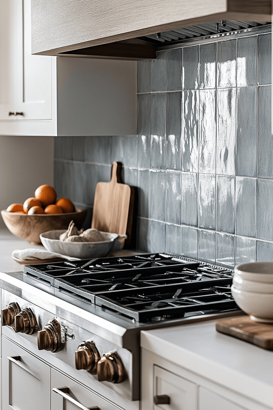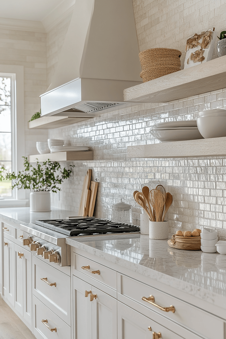 ★ Pro Tip: Install pearl shell tile on a single focal wall behind the range to maximize impact without overwhelming the space—keep surrounding walls in soft white to amplify the iridescence.