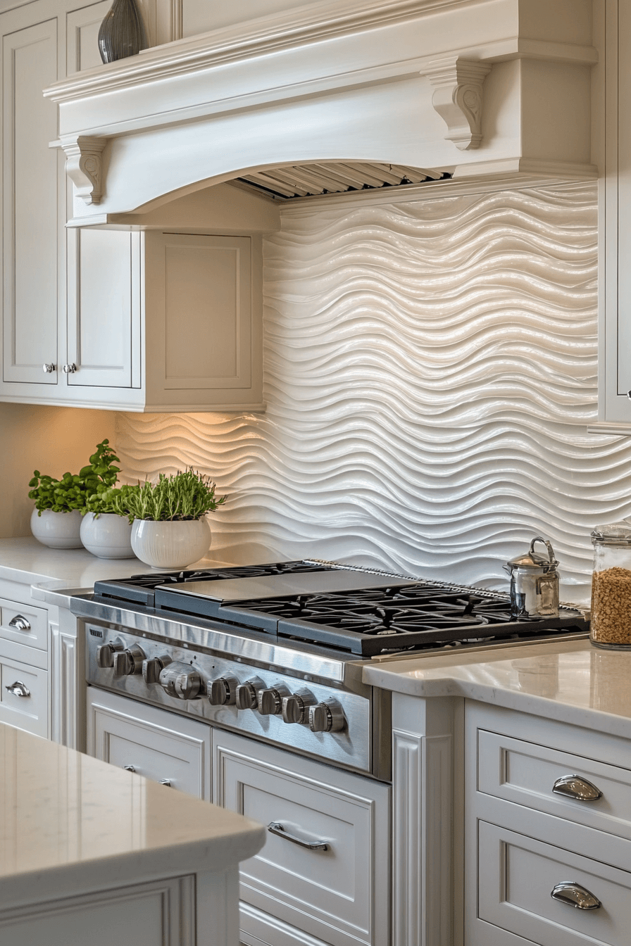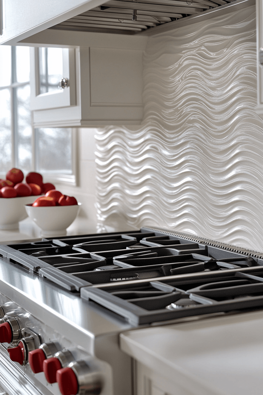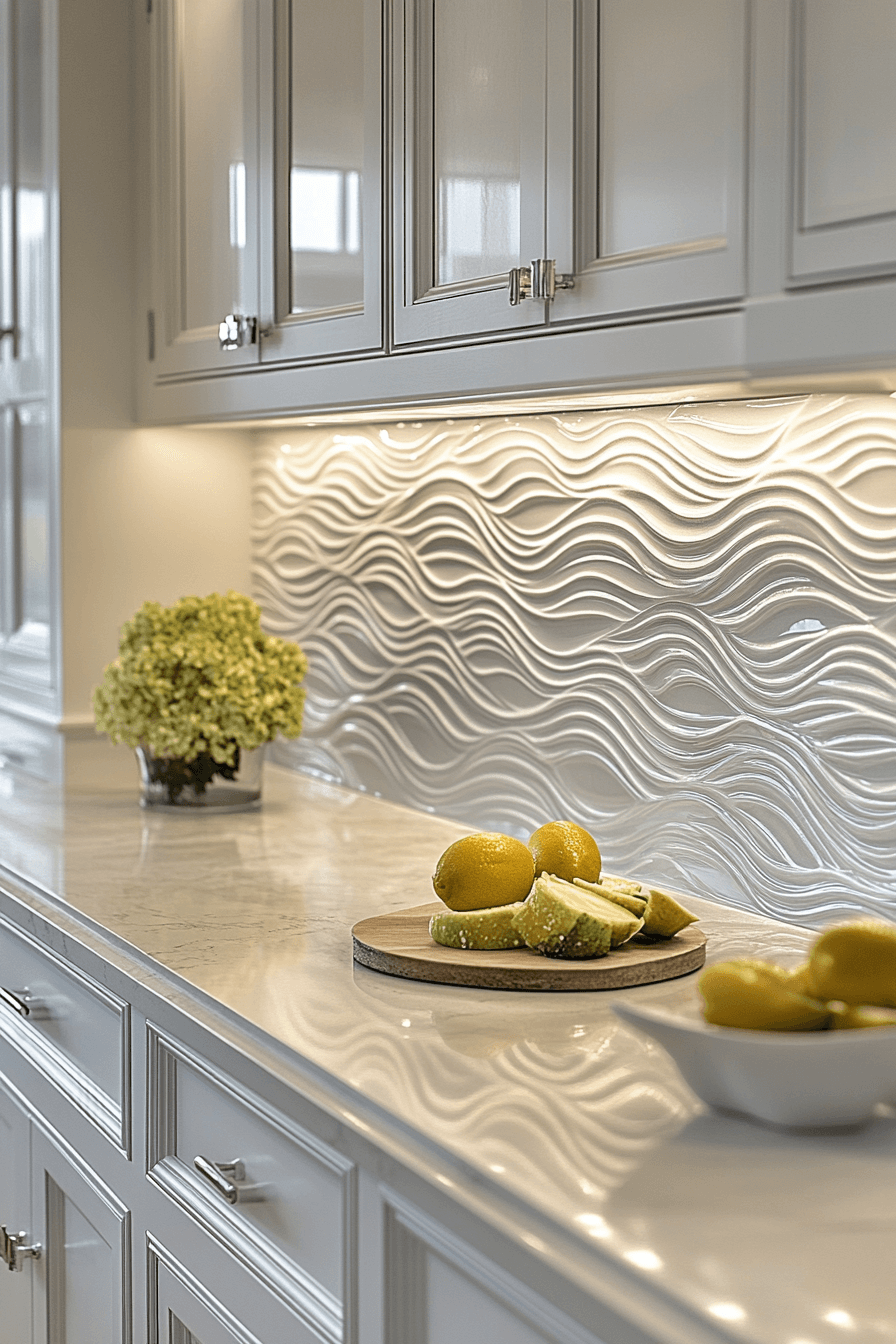 ✋ Avoid This: Avoid cool-toned LEDs that flatten the dimensional surface; they wash out the gentle shadows that make rippled tile feel alive. Skip glossy upper cabinets that compete with the backsplash texture.