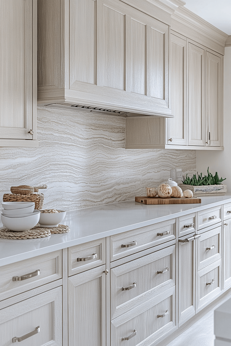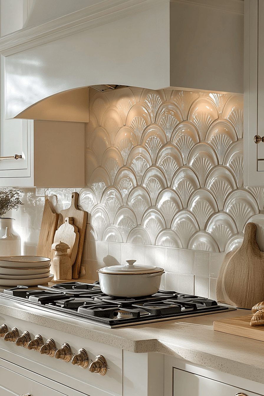 Sculpted tiles with flowing texture elevate coastal kitchen backsplash ideas by adding tactile depth inspired by ocean movement. Under-cabinet lighting enhances the dimensional surface, creating gentle shadows and highlights. This design works especially well in minimalist kitchens where texture replaces bold color. Artistic detail remains calming and cohesive. The backsplash becomes quietly expressive. Explore coastal kitchen backsplash ideas that bring movement and artistry into your space.