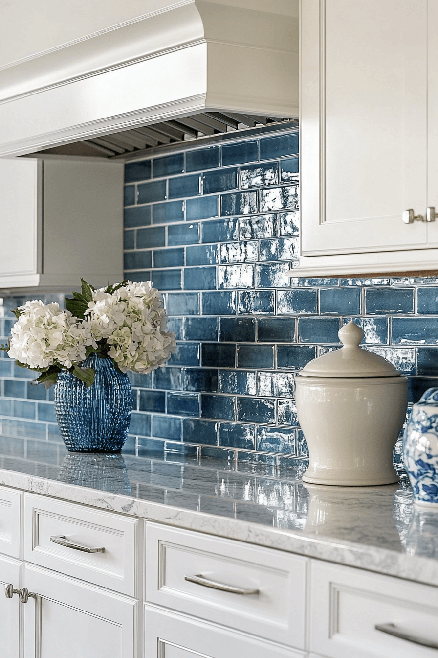 There’s something quietly luxurious about a backsplash that catches morning light like a wave—this deep blue reads expensive without trying too hard, especially when your coffee mugs are the only color competition.