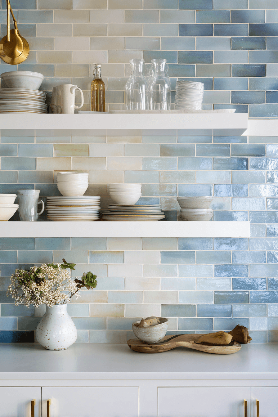 Glass tiles with a mist-like shimmer bring light and movement into coastal kitchen backsplash ideas that prioritize brightness and depth. Their translucent quality adds dimension while echoing the clarity of coastal waters. When paired with crisp cabinetry and soft metallic accents, the effect feels refined yet organic. Light dances across the surface throughout the day. The kitchen feels luminous and fresh. Explore coastal kitchen backsplash ideas that glow with ocean-inspired elegance.