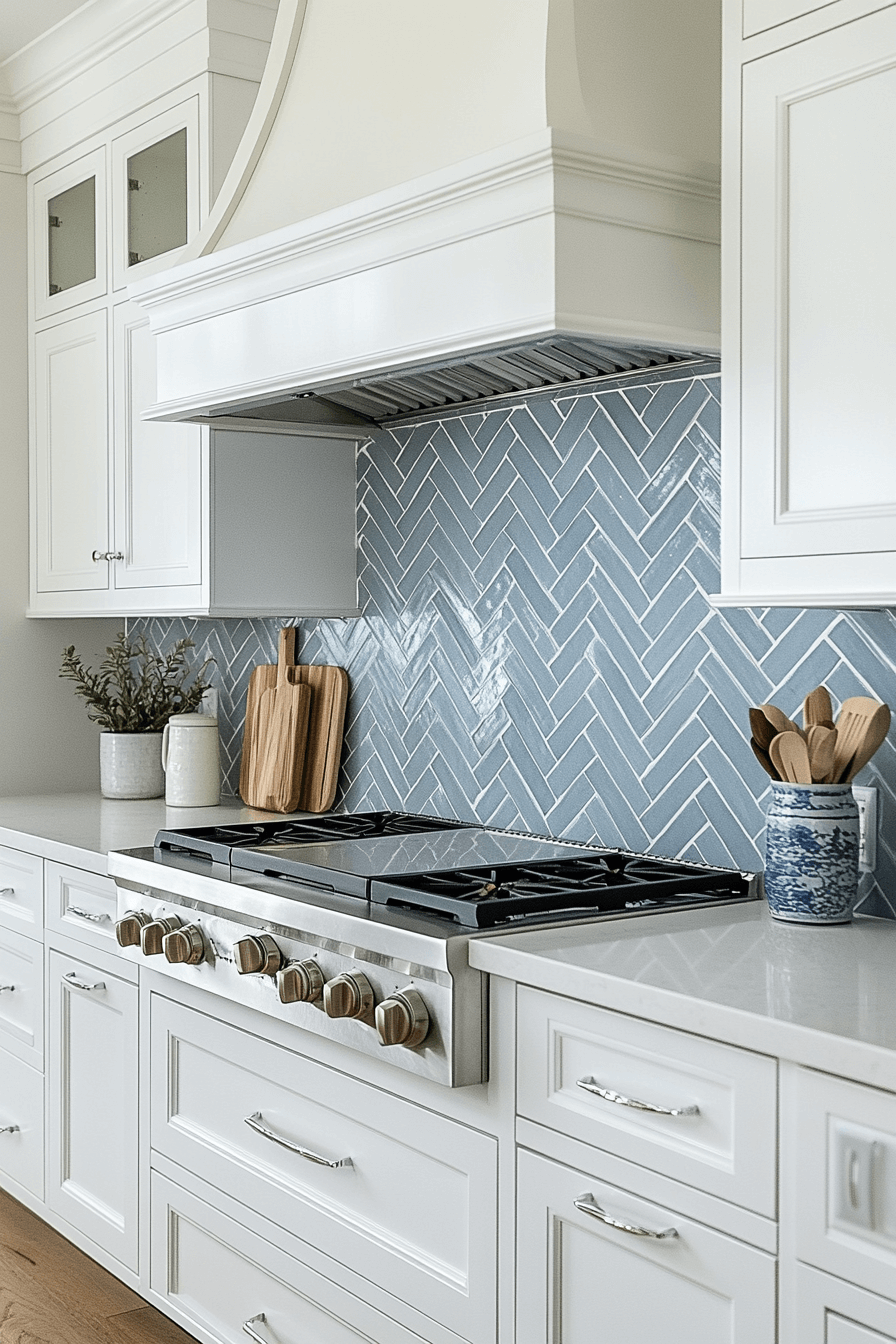 There’s something instantly calming about walking into a kitchen that feels like low tide—this blue chevron pattern captures that rhythm without shouting for attention.