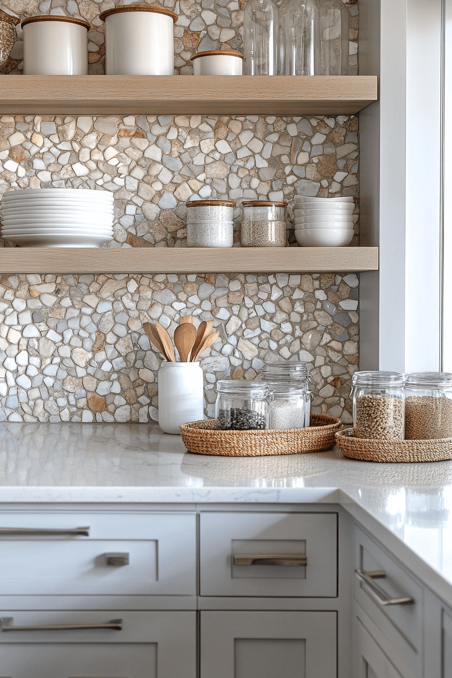 Stone-inspired mosaic tiles in driftwood and sand tones add organic grounding to coastal kitchen backsplash ideas rooted in nature. The textured surface evokes shoreline elements while balancing brighter kitchen features. White cabinets and stone counters pair seamlessly with this look. Visual interest builds without distraction. The result feels earthy and coastal. Explore coastal kitchen backsplash ideas that celebrate natural texture.