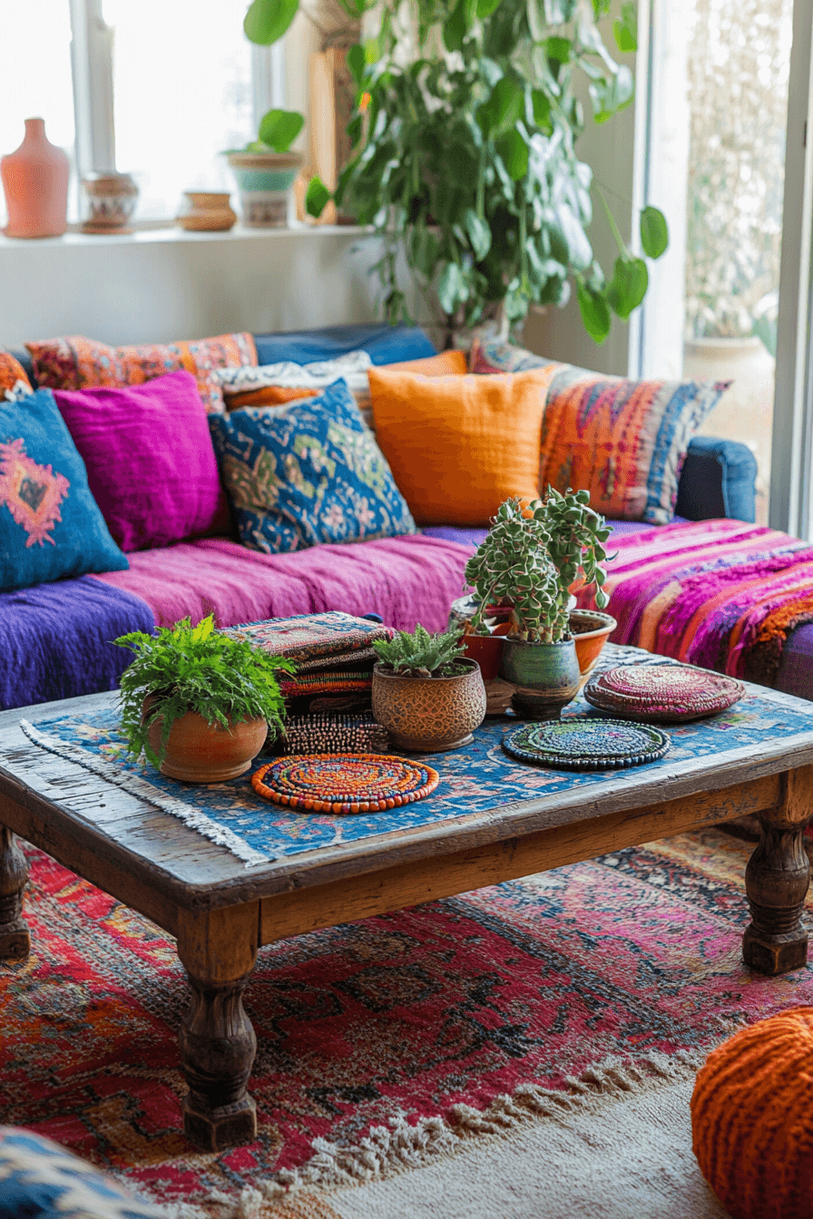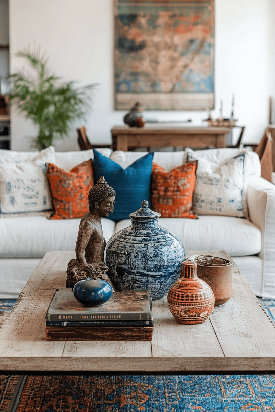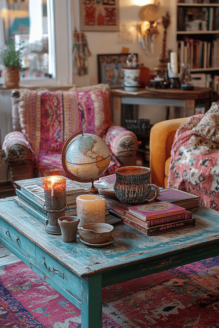 Bohemian coffee table decor ideas celebrate creativity, color, and collected treasures. Layered textiles, patterned books, and meaningful objects add depth and personality. Global influences bring warmth and storytelling to the table. The look feels relaxed and expressive. Perfect for free-spirited homes.