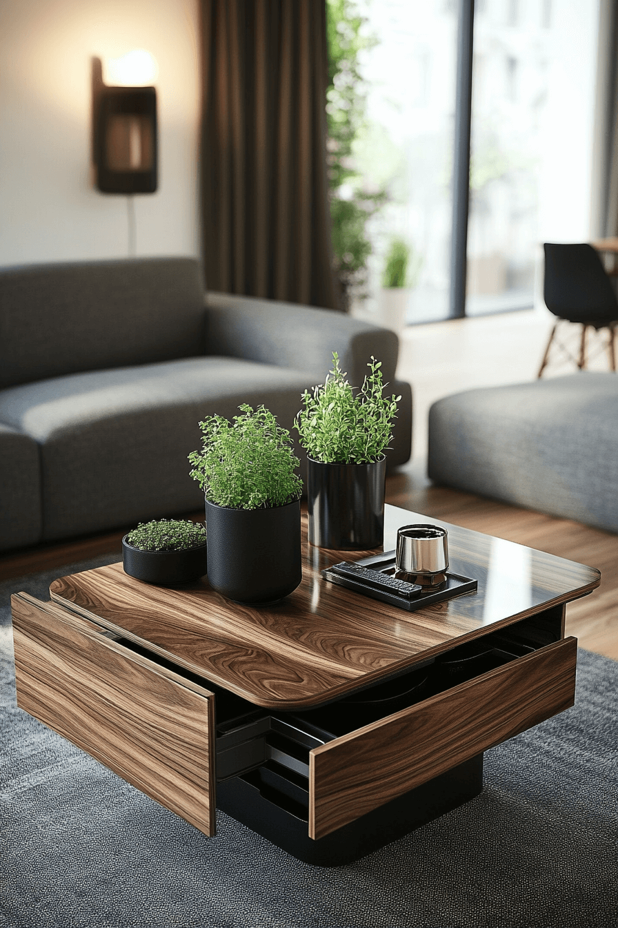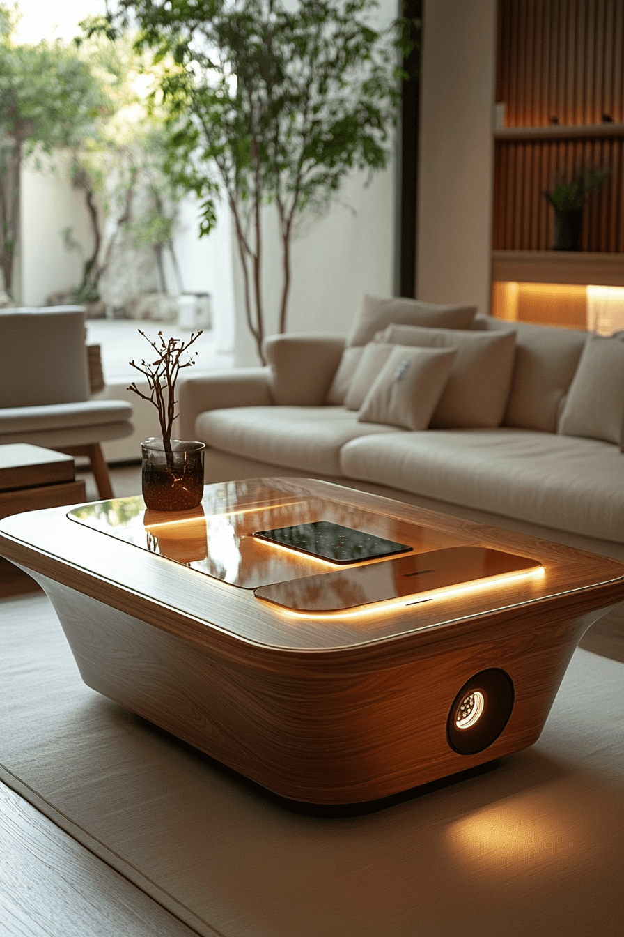 Tech-forward coffee table decor ideas merge sleek design with modern convenience. Smart accessories like wireless chargers or minimalist speakers keep things functional and stylish. Clean lines and neutral tones maintain a clutter-free look. This setup feels futuristic yet refined. Ideal for tech-savvy homes.