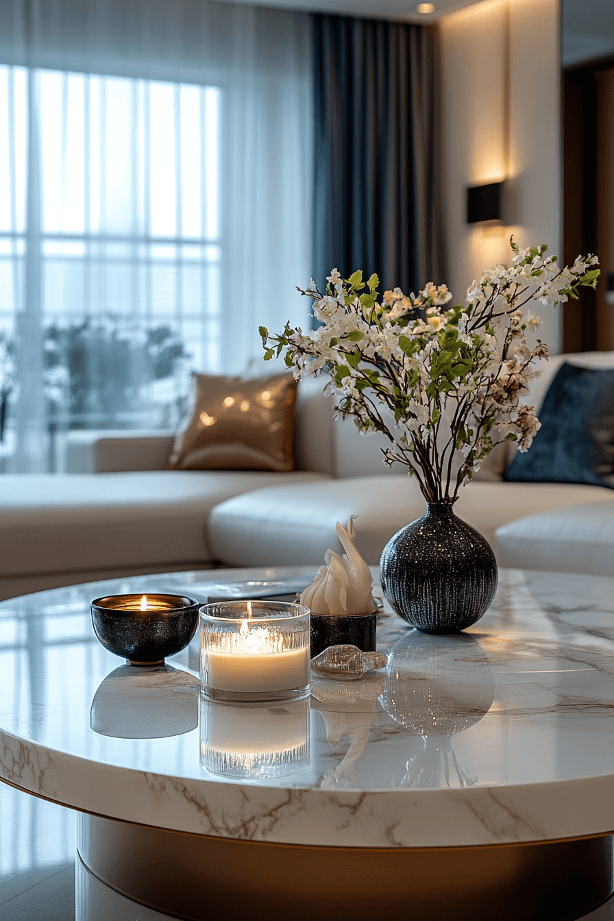 Marble-accented coffee table decor ideas bring timeless elegance and sophistication into the room. Marble trays, candle holders, or decorative objects add instant polish. The natural veining creates visual interest without overpowering the table. This style pairs beautifully with soft fabrics and metallic accents. It feels refined and luxurious.
