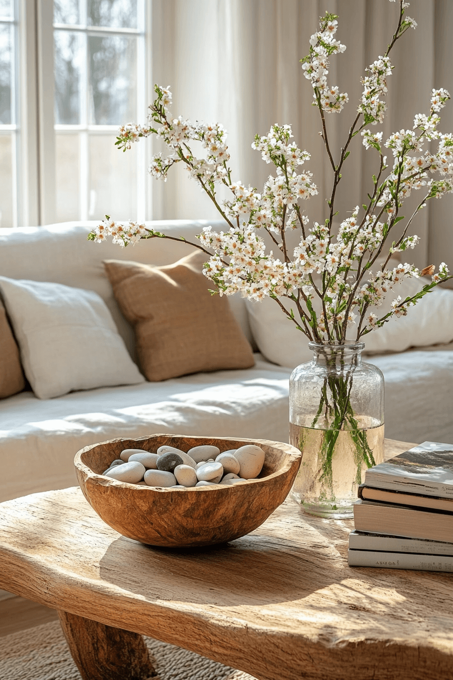 Nature-inspired coffee table decor ideas bring the outdoors inside through organic materials and greenery. Wood, stone, plants, and natural textures add balance and calm. These elements create a grounding visual presence. The style feels peaceful and refreshing. Perfect for nature lovers.