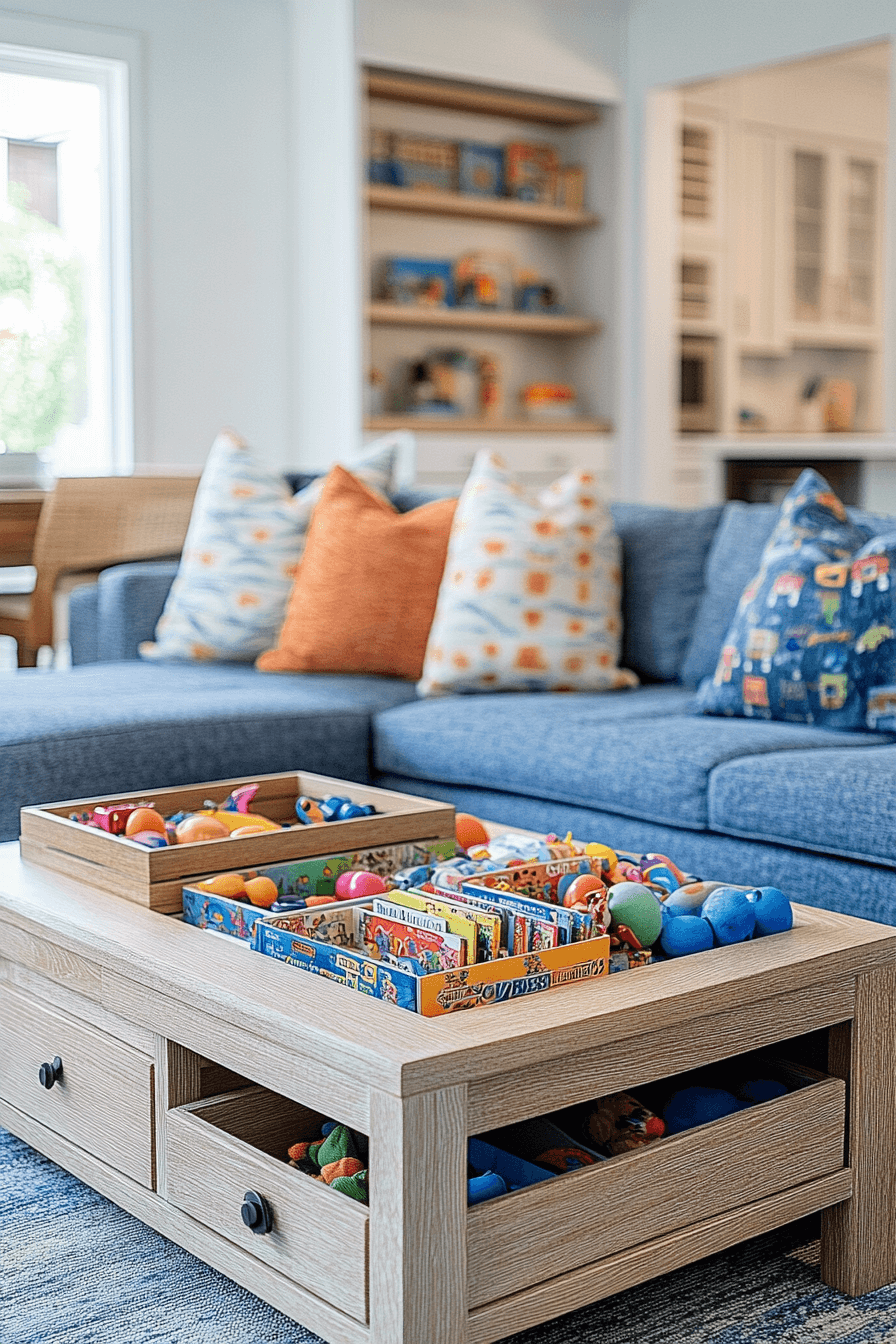 Kid-friendly coffee table decor ideas focus on safety without sacrificing style. Soft edges, durable finishes, and functional storage keep the space worry-free. Activity trays or books add playful energy. The table becomes part of family life. Practical and inviting.