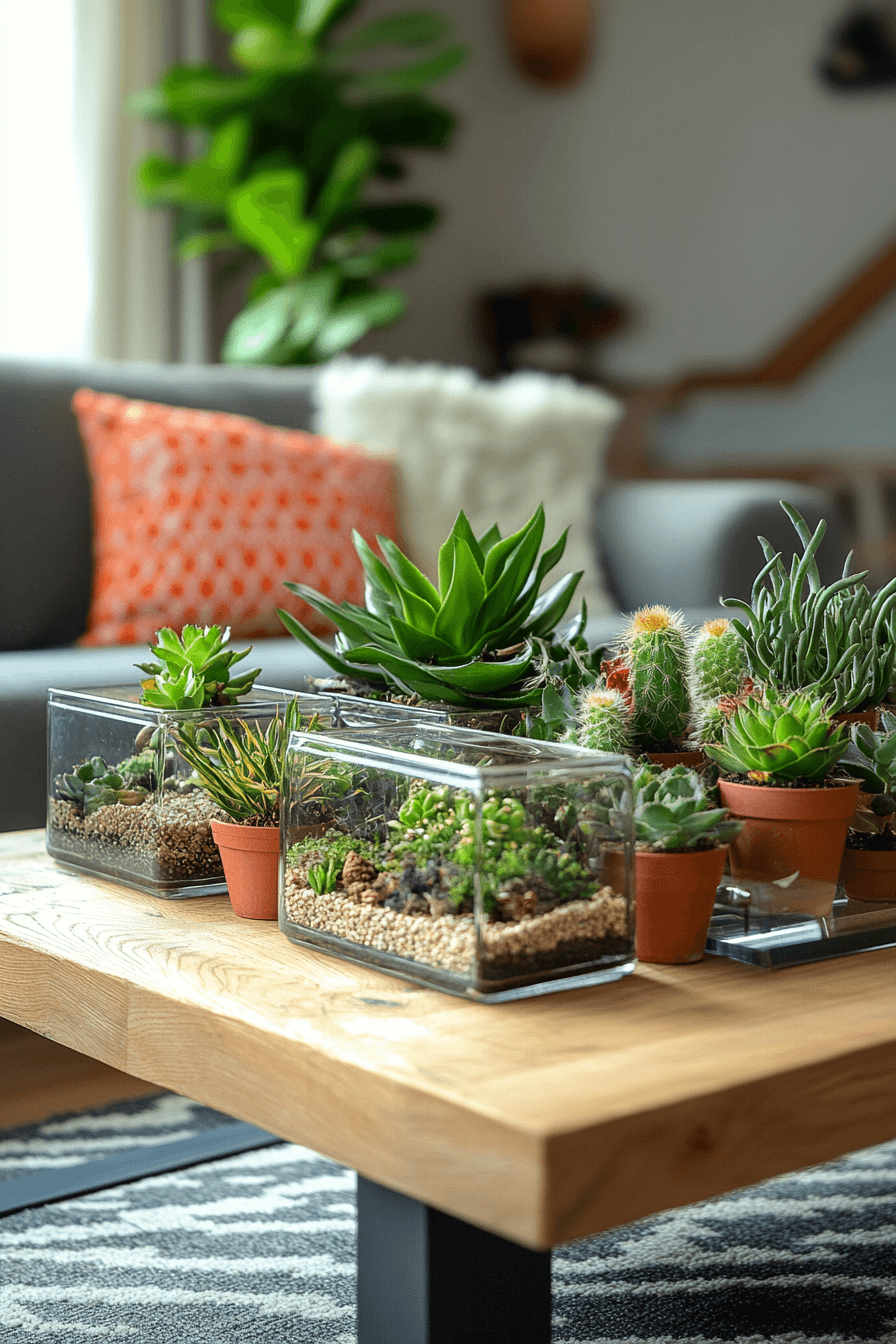 Terrarium-style coffee table decor ideas introduce greenery through compact, low-maintenance displays. Glass containers filled with moss or succulents create visual interest. These miniature landscapes feel fresh and modern. Perfect for plant lovers with limited space. The look feels alive and artistic.