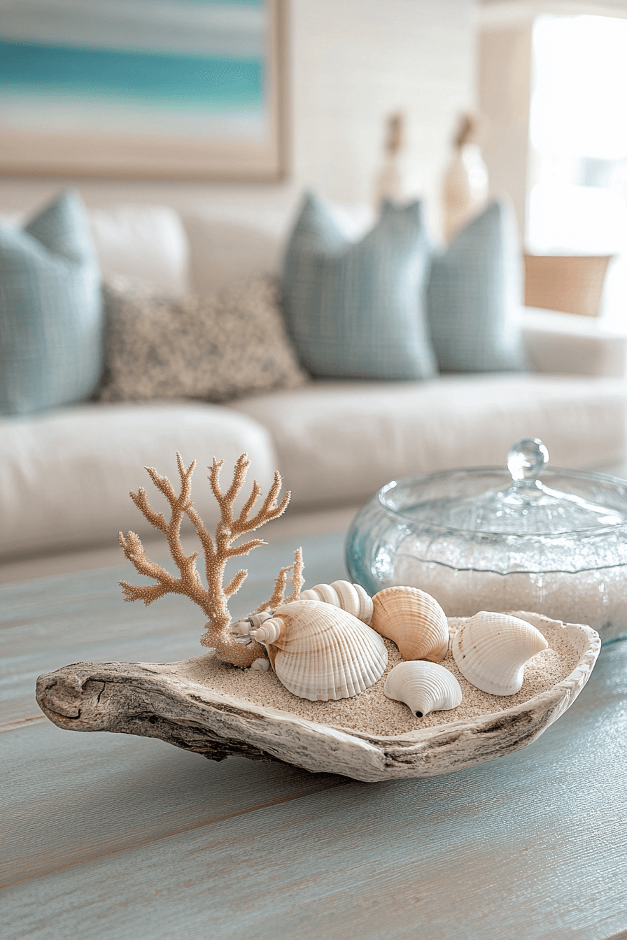 Coastal-inspired coffee table decor ideas bring a breezy, relaxed energy into your living room. Soft blues, sandy neutrals, and natural textures evoke a seaside feel. Accents like driftwood, shells, or glass vessels enhance the airy aesthetic. The result feels light, calming, and refreshing. Perfect for creating a vacation-at-home vibe.