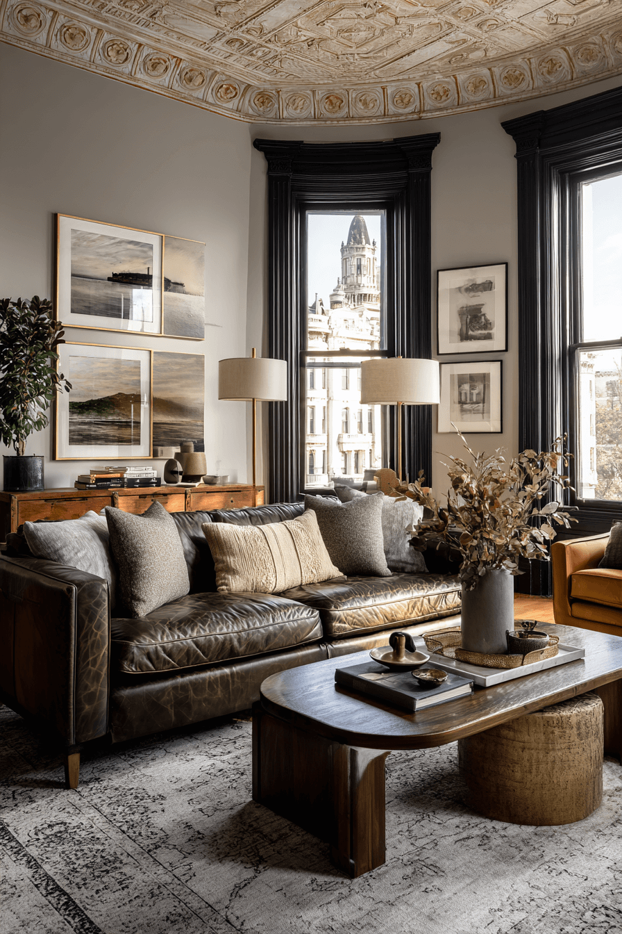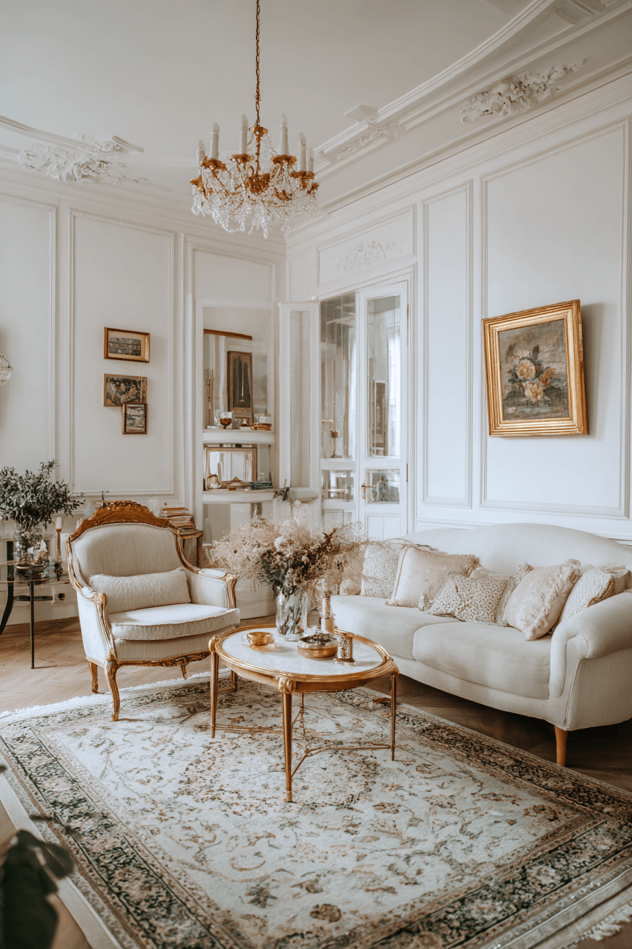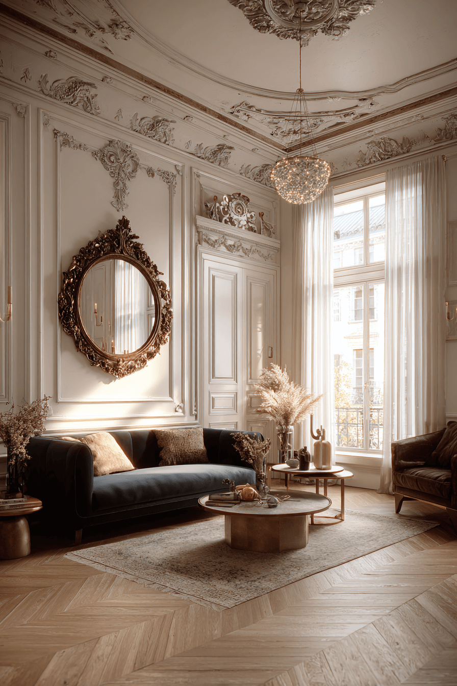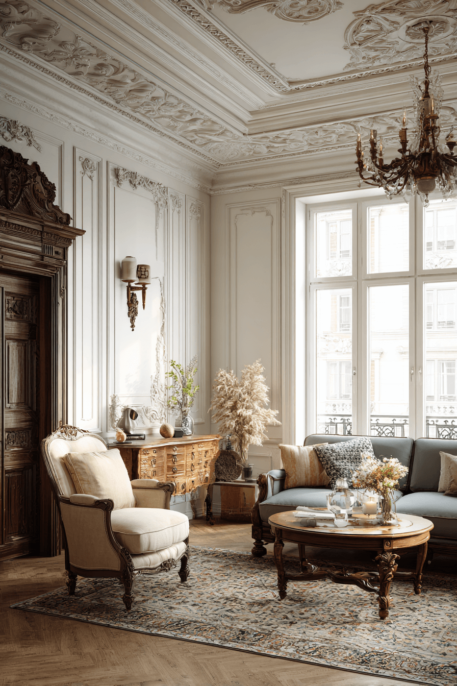 Parisian-inspired comfort brings subtle elegance into a cozy vintage apartment with effortless charm. Decorative mirrors, soft molding, and neutral seating create refined beauty. Romantic textures prevent the room from feeling overly formal. Gentle lighting enhances the lived-in glow. The blend of sophistication and ease makes it perfect for apartment living. Add a touch of Parisian grace to your space now.