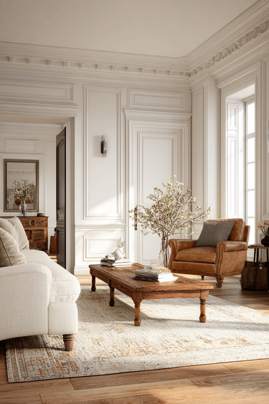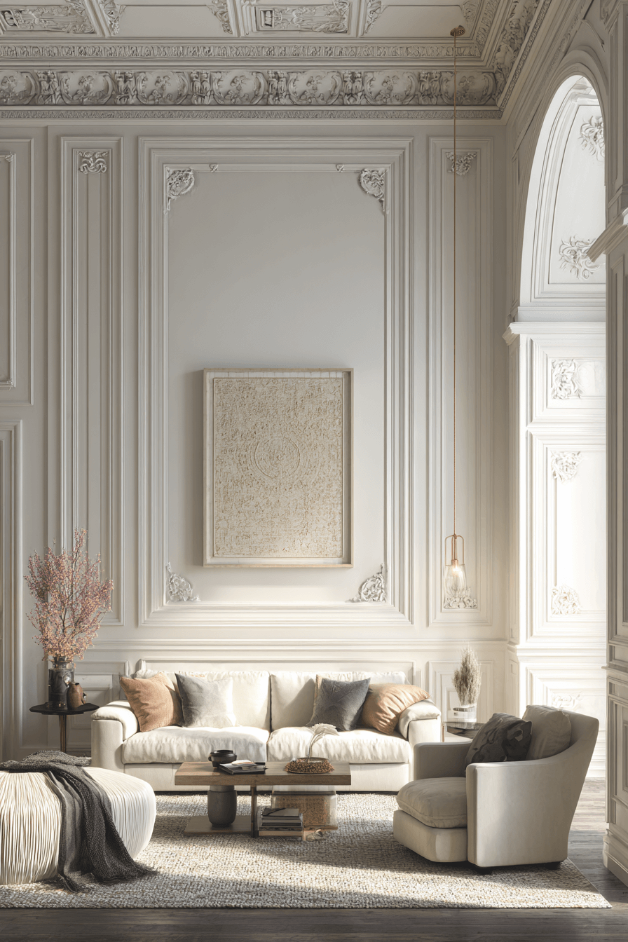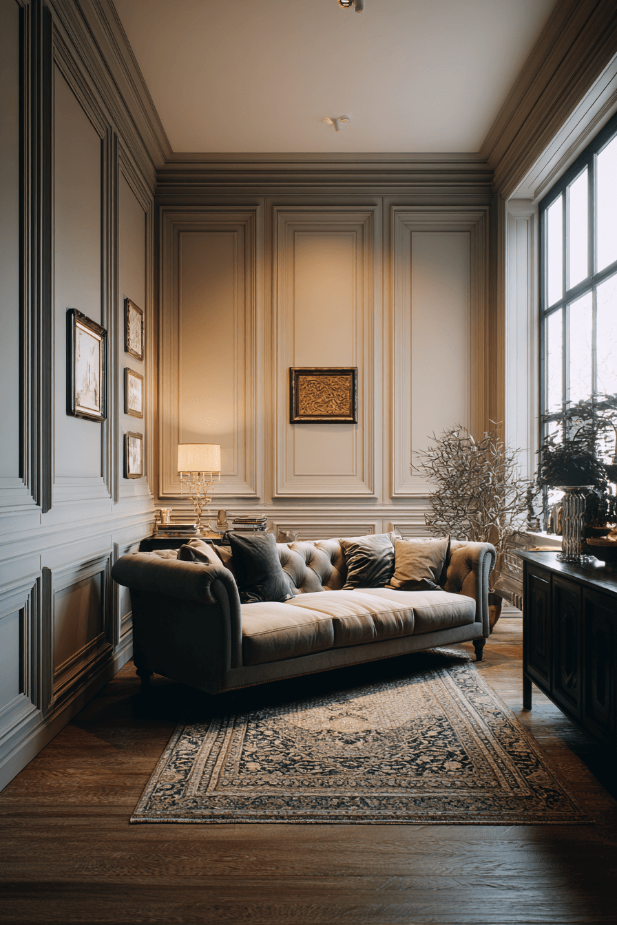 Panel molding elevates a cozy vintage apartment with subtle architectural depth. Clean finishes modernize traditional detail. Plush seating keeps the space comfortable. The design gains dimension without clutter. Classic structure meets softness beautifully. Enhance your apartment with timeless wall detail today.