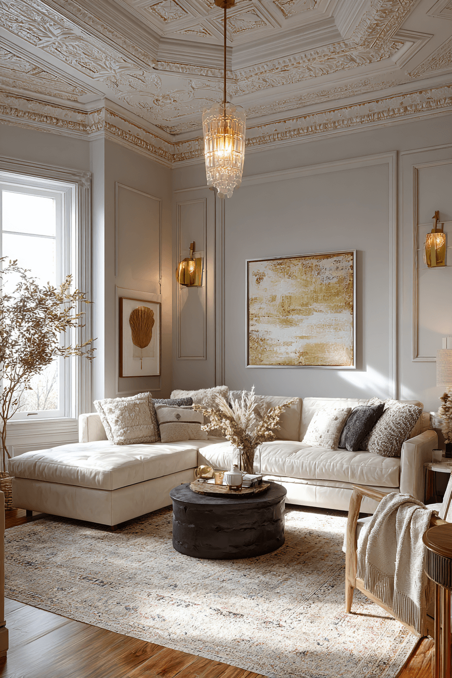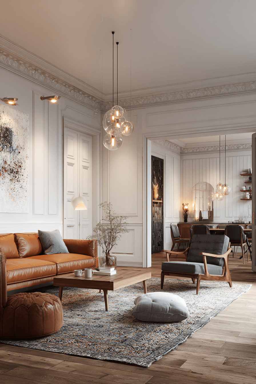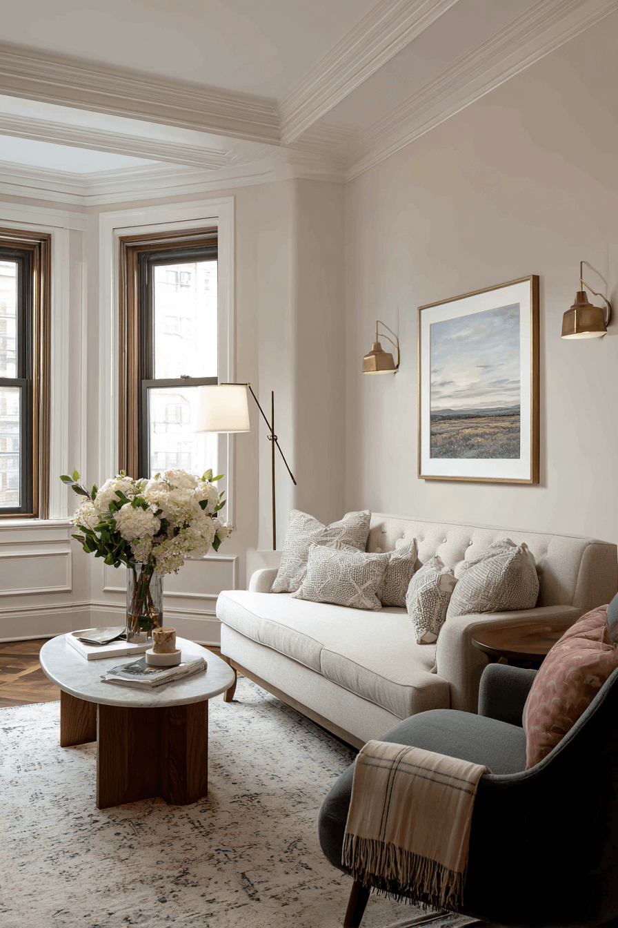 Panel molding elevates a cozy vintage apartment with subtle architectural depth. Clean finishes modernize traditional detail. Plush seating keeps the space comfortable. The design gains dimension without clutter. Classic structure meets softness beautifully. Enhance your apartment with timeless wall detail today.