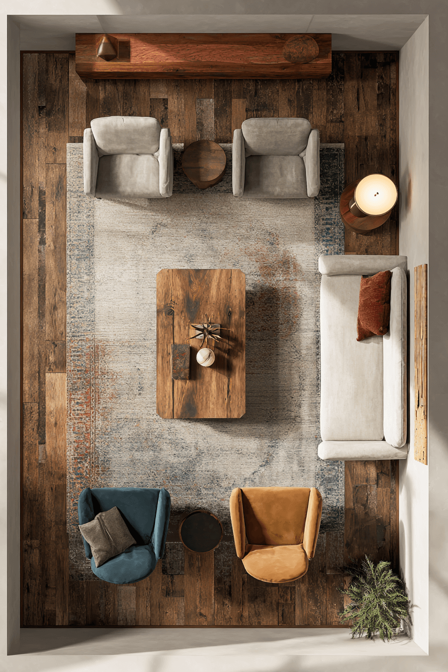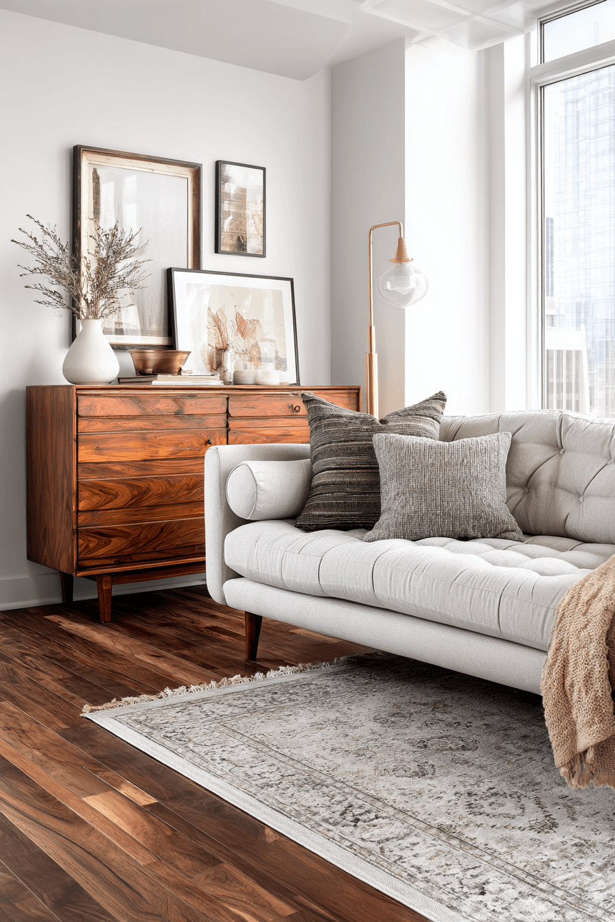 A refined rustic vintage mix balances wood warmth with polished styling in a cozy vintage apartment. Textured fabrics soften structured pieces. Careful editing keeps everything intentional. The design feels relaxed yet elevated. Comfort never feels heavy. Discover rustic refinement for your apartment today.