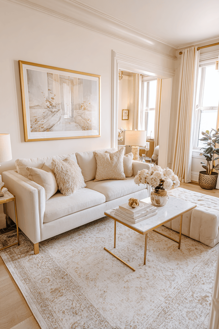Soft golden accents introduce glow into a cozy vintage apartment without overpowering it. Cream textiles and classic forms maintain balance. Metallic warmth reflects light gently. The atmosphere becomes inviting and refined. Shine enhances comfort rather than dominating. Add subtle gold warmth to your decor now.