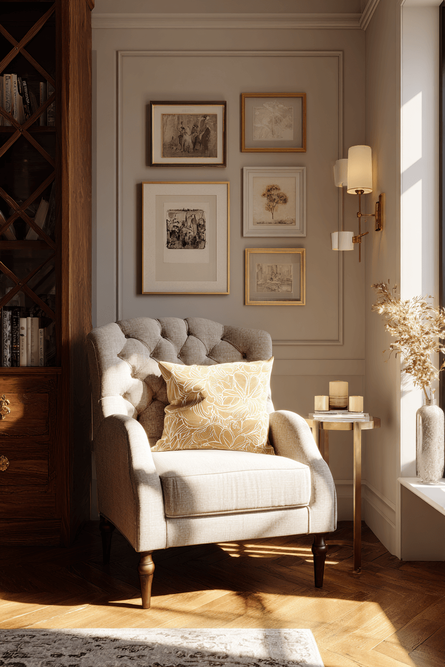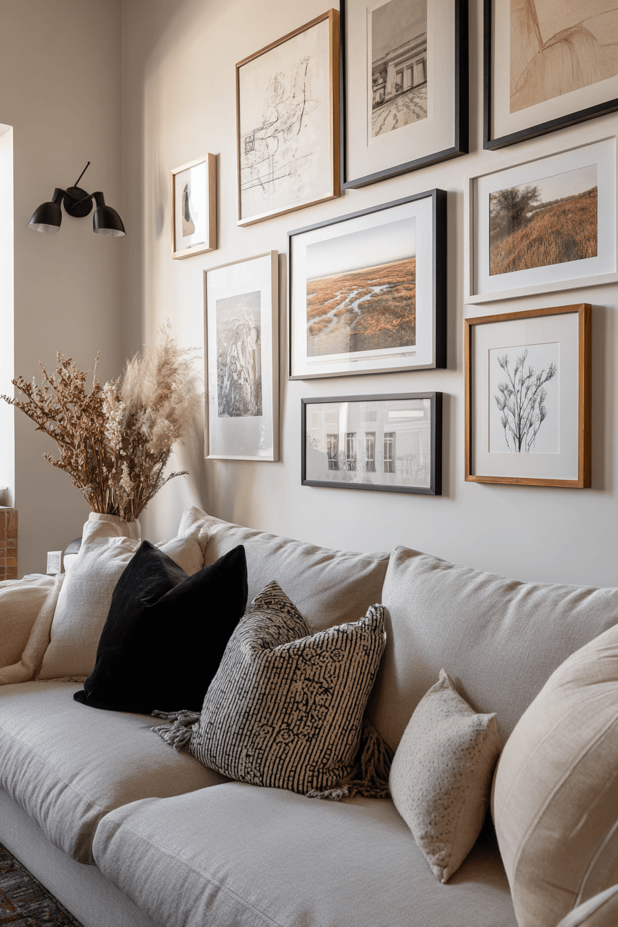 A vintage-inspired gallery arrangement adds storytelling to a cozy vintage apartment. Mixed frame sizes create layered interest. Neutral walls provide contrast. The display becomes a focal point without chaos. Character builds vertically without using floor space. Curate your own vintage gallery wall now.