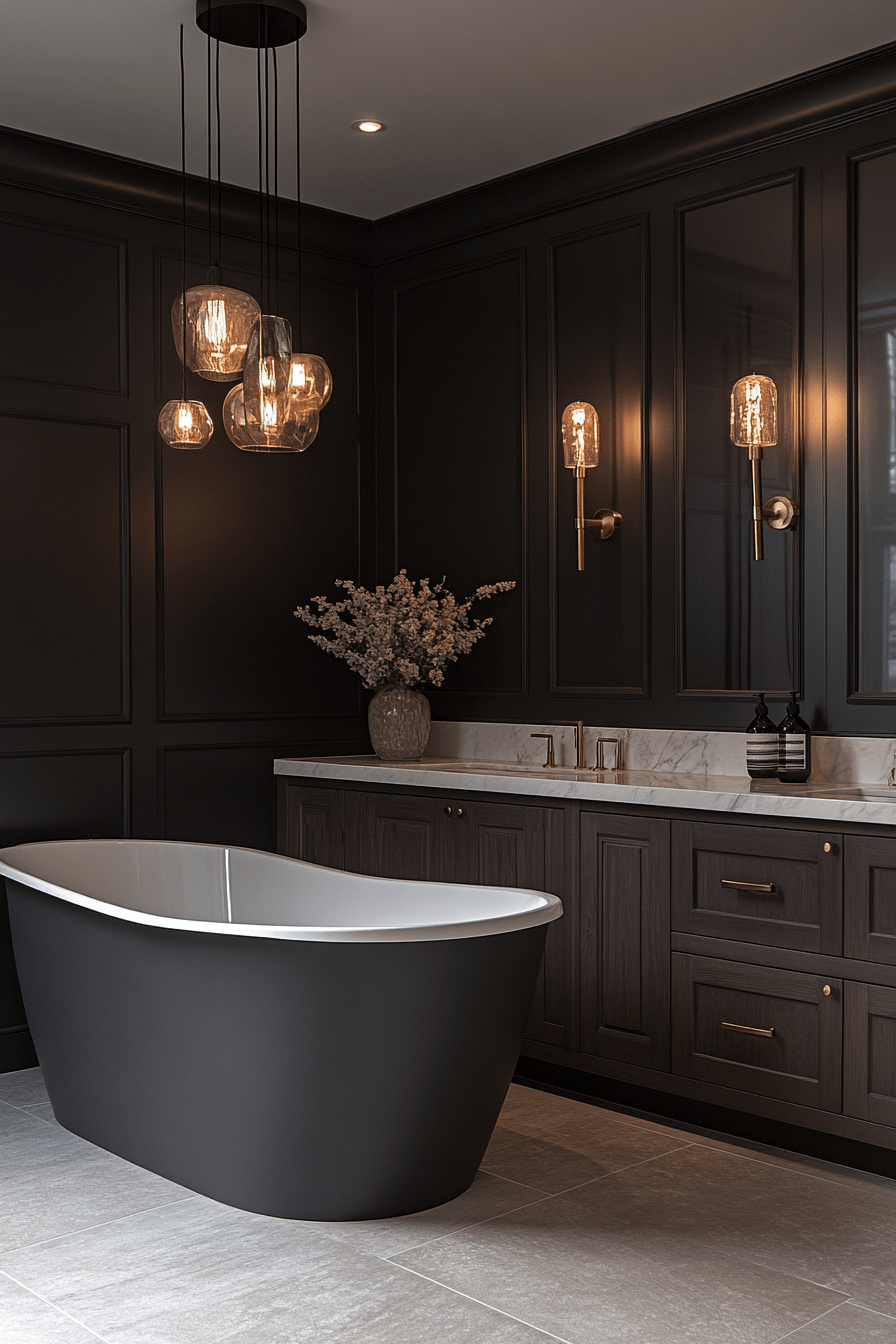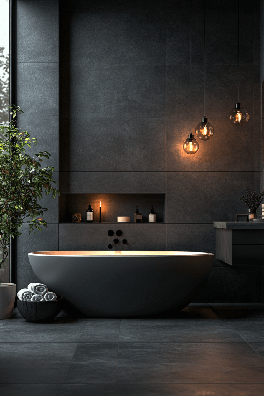 This refined retreat brings spa comfort into everyday living. A dark grey bathroom feels inviting with soft lighting, a freestanding tub, and polished finishes. Subtle textures elevate the overall mood. Statement lighting adds a touch of drama. The space feels luxurious yet approachable.