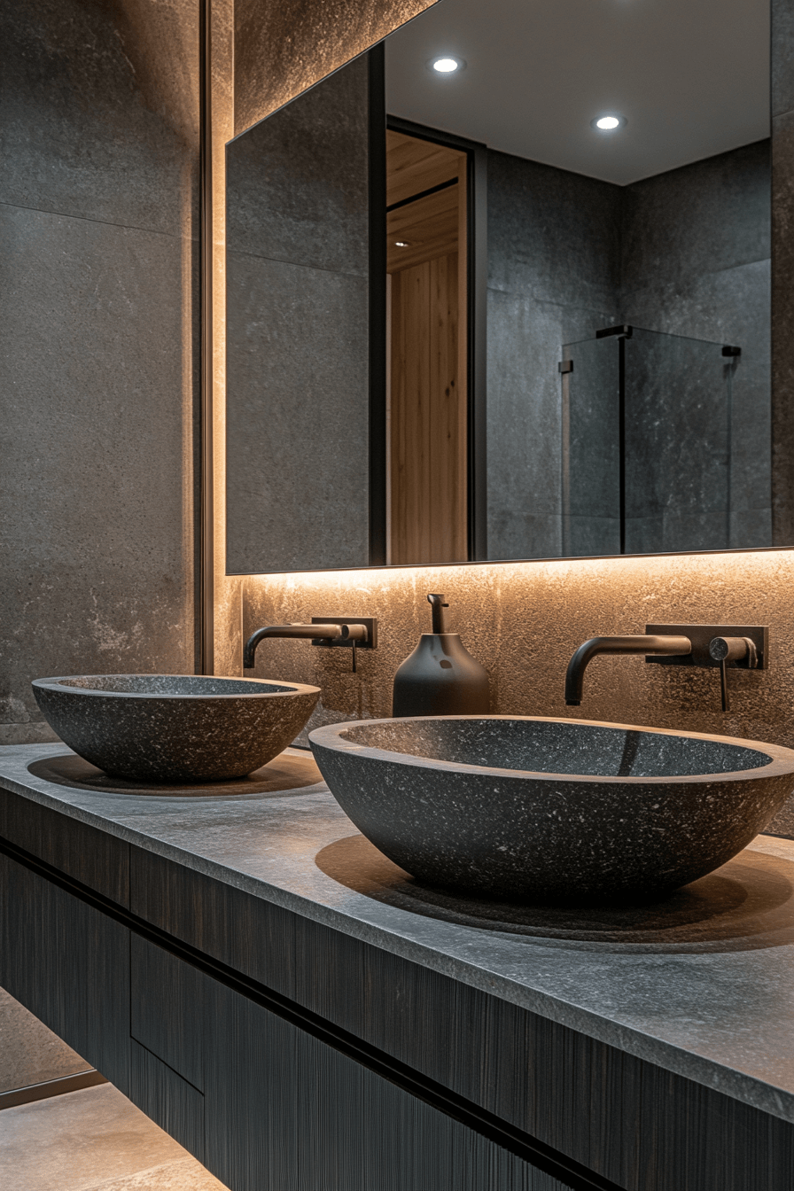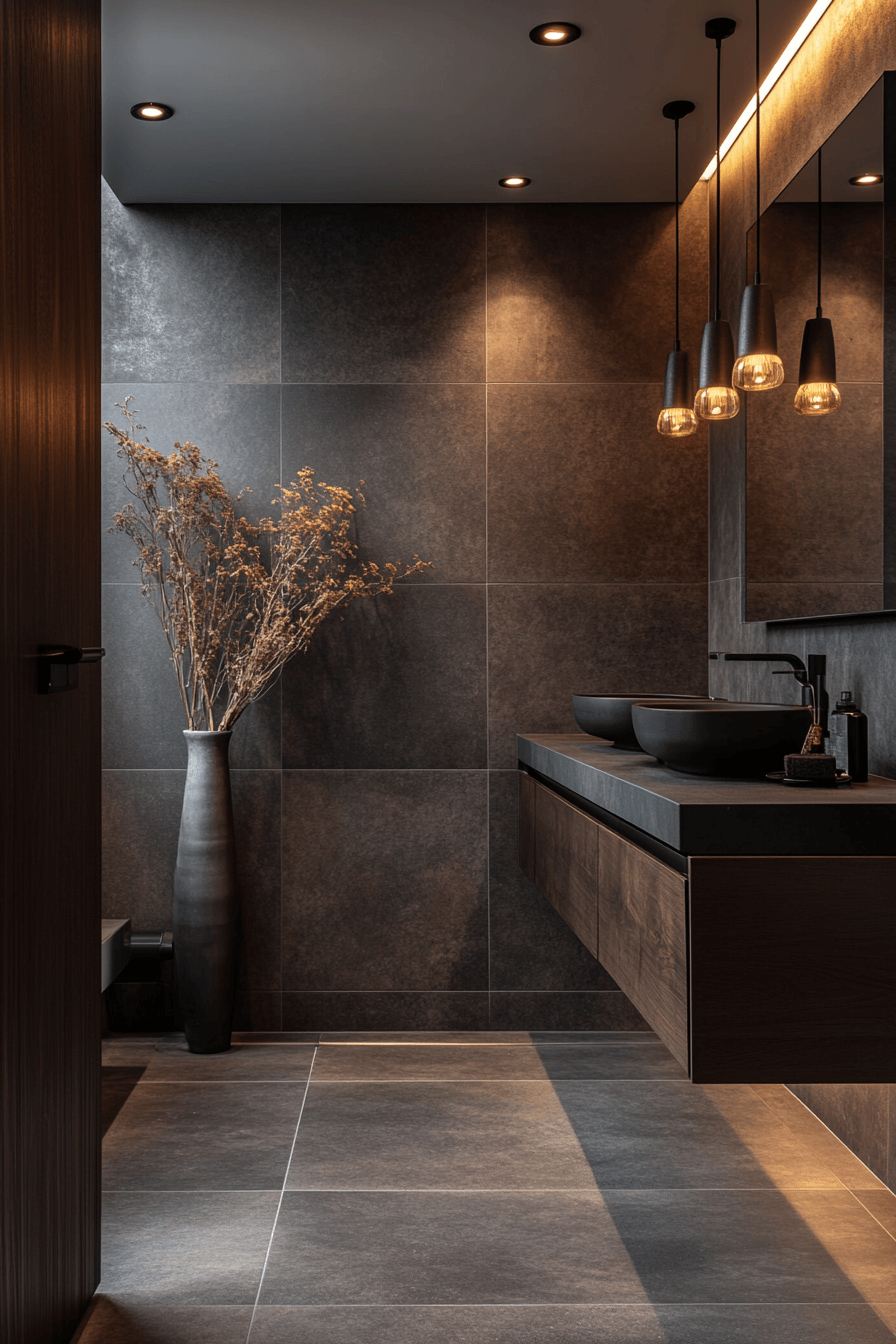 Dramatic depth meets modern elegance in this striking design. A dark grey bathroom using graphite tones creates instant visual impact. Black fixtures and sculptural lighting sharpen the contemporary feel. Stone counters add contrast and luxury. Clean styling lets textures stand out.