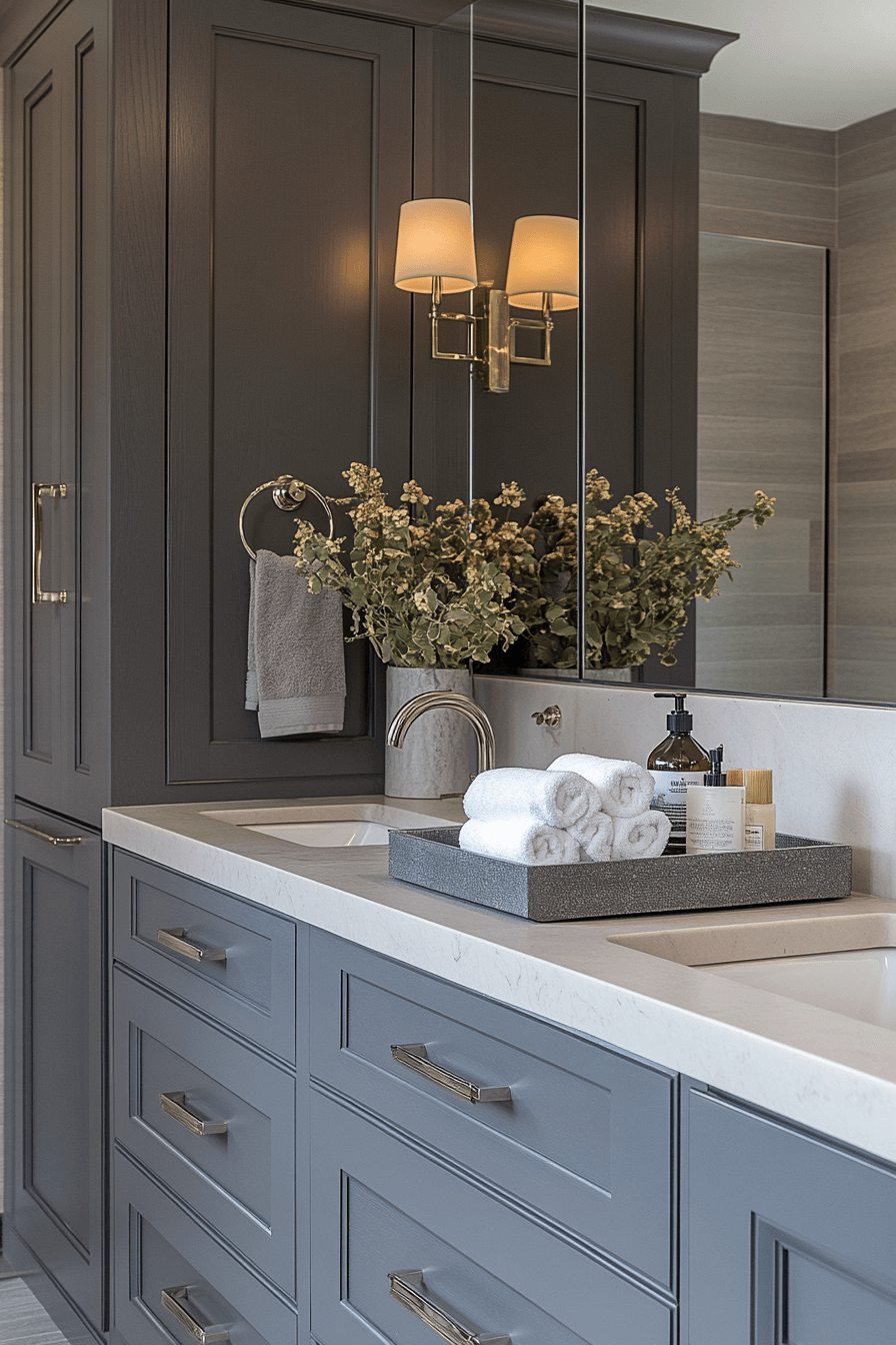 Luxurious finishes elevate this bold yet elegant space. A dark grey bathroom styled with charcoal cabinetry and metallic accents feels refined and modern. Marble surfaces add brightness and sophistication. Soft lighting deepens the richness of the palette. The look is upscale without being overwhelming.