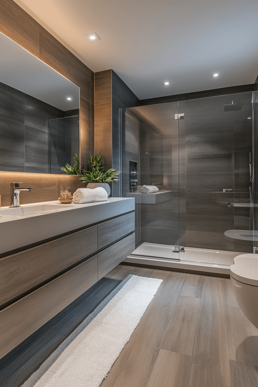 This calming retreat balances luxury and relaxation through rich tones and refined finishes. A dark grey bathroom feels soothing when layered with soft lighting and natural textures like stone and wood. Floating vanities and clear glass showers keep the layout visually open. Large mirrors help amplify light and depth.