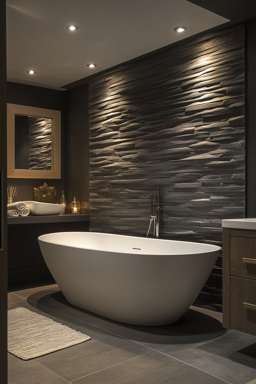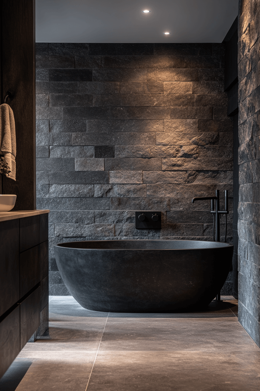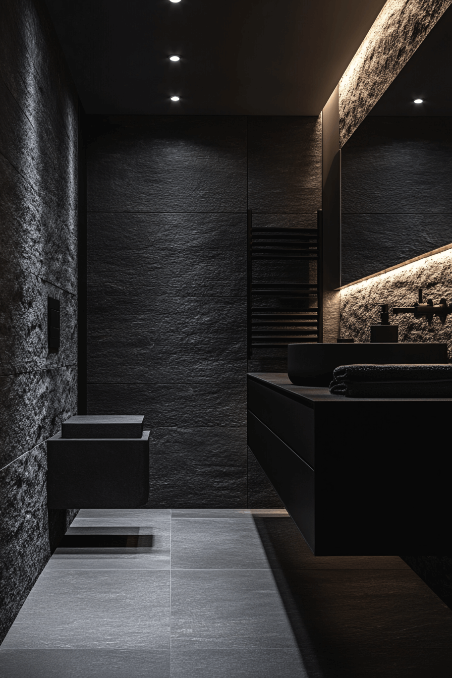 Architectural layering creates drama without chaos. A dark grey bathroom featuring stacked slate walls and seamless flooring feels immersive. White fixtures offer bold contrast. Focused lighting highlights the texture and structure. The design feels intentional and bold.