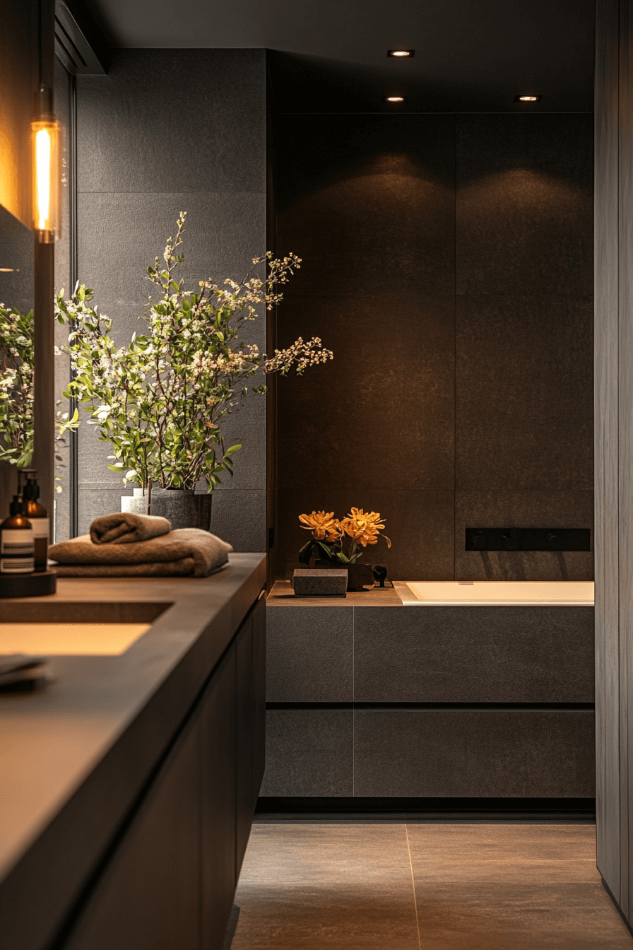 This design blends bold tones with quiet calm for a timeless feel. A dark grey bathroom styled with slate hues and large-format tiles feels cohesive and expansive. Floating fixtures and minimal decor enhance the peaceful layout. Subtle lighting softens the darker palette beautifully. Warm accents add balance without clutter.