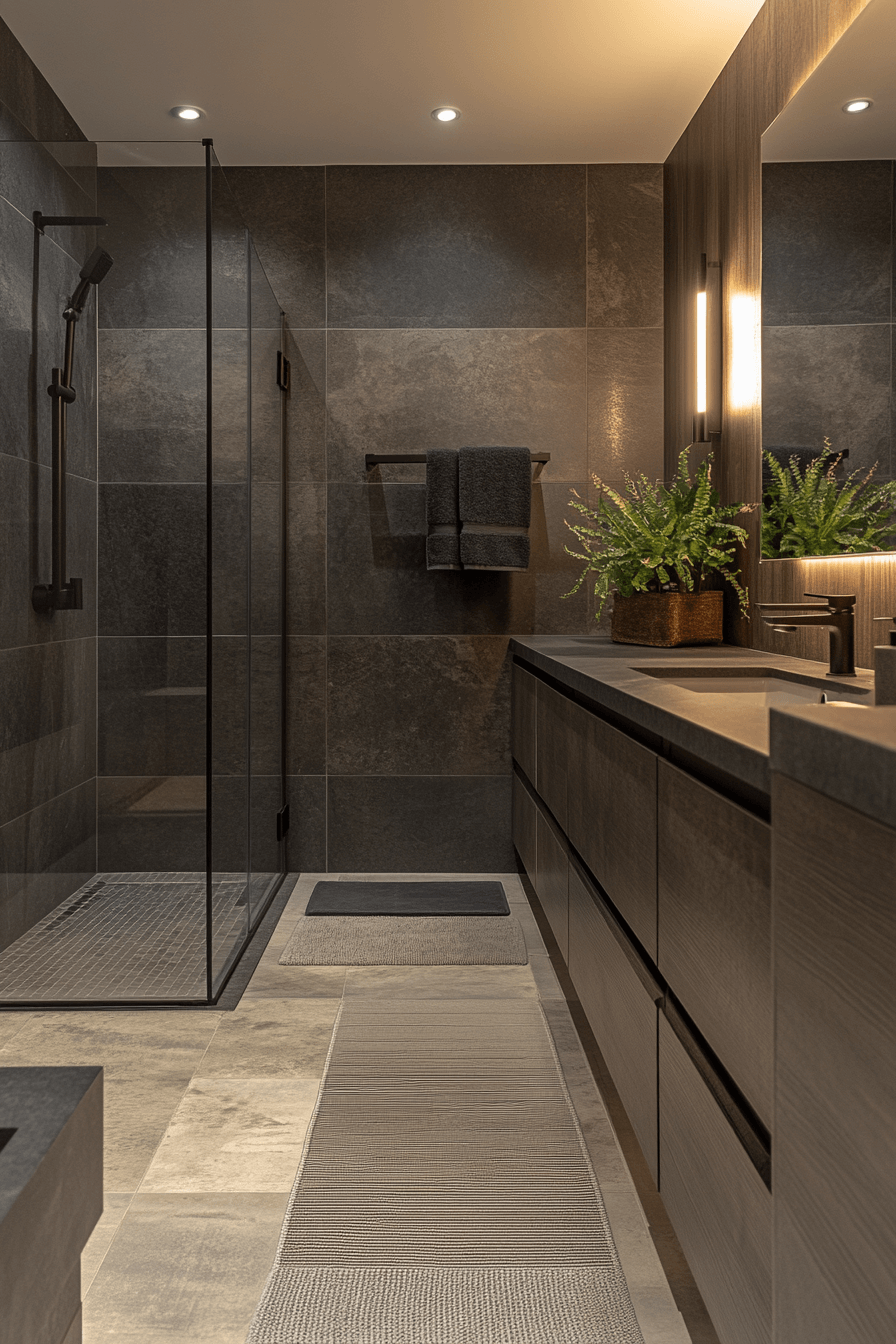 26. Rich Charcoal Bathroom Flow