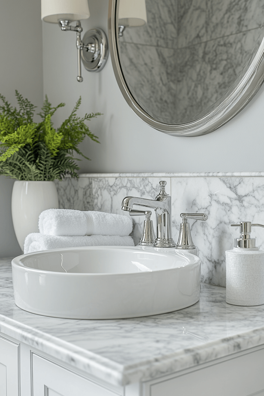 Bold veining and rich texture define this luxurious look. A dark grey bathroom styled with marble surfaces feels dramatic and timeless. Black hardware sharpens the modern edge. Sculptural lighting completes the design. The space feels powerful and refined.
