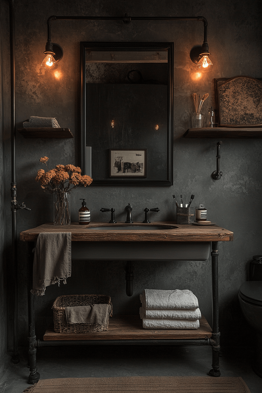 Raw materials define this edgy and stylish layout. A dark grey bathroom featuring concrete finishes and black steel accents feels bold and urban. Exposed lighting enhances the industrial feel. Open shelving keeps the space functional. The result is striking and modern.