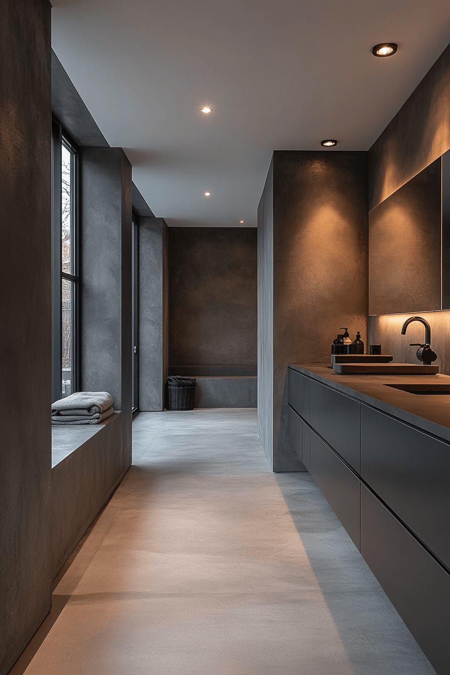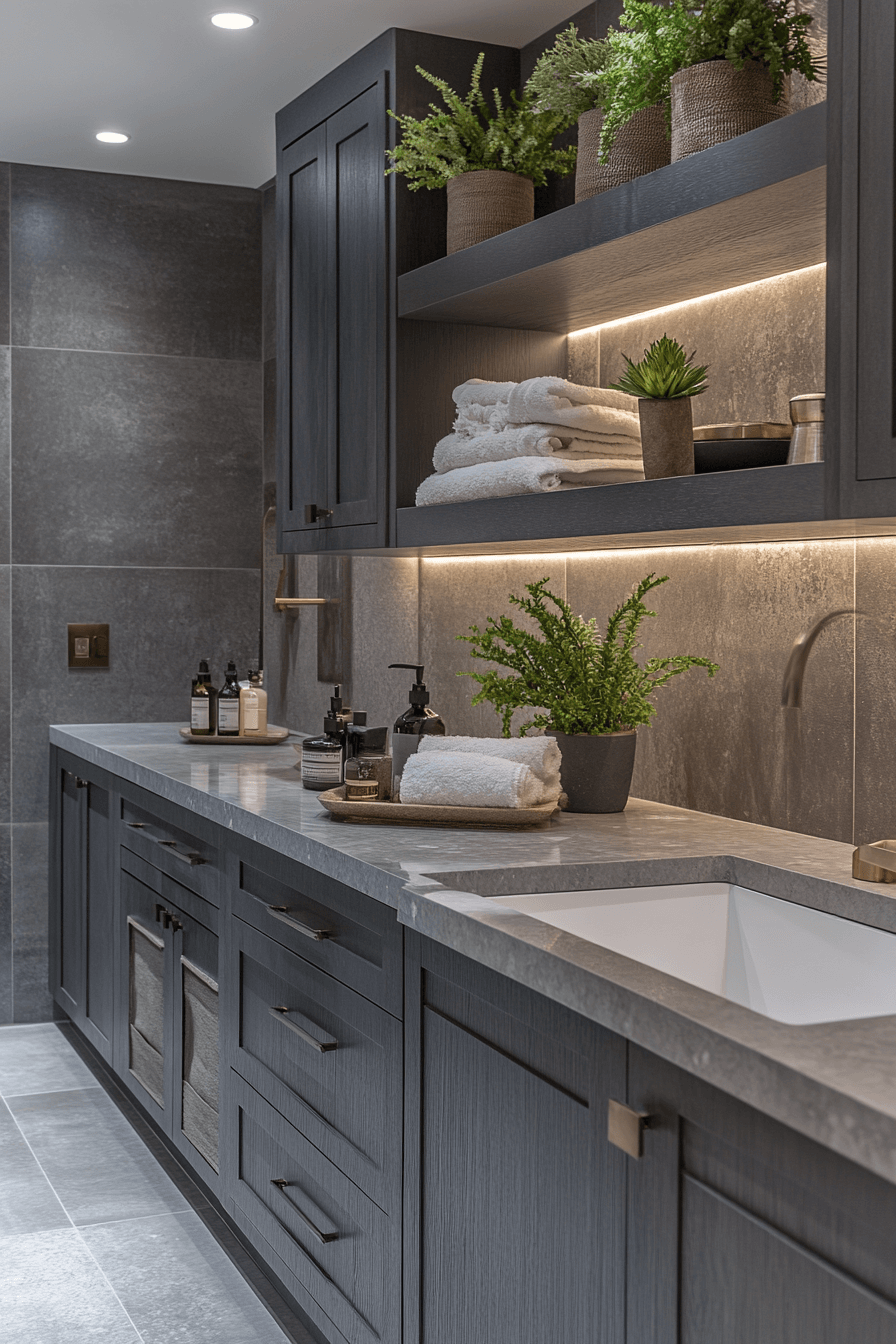 Clean structure and calm tones shape this minimalist design. A dark grey bathroom with smooth slate walls feels open and serene. Underlit counters soften the darker palette. Neutral textiles and wood accents bring warmth. The look is quiet and elegant.