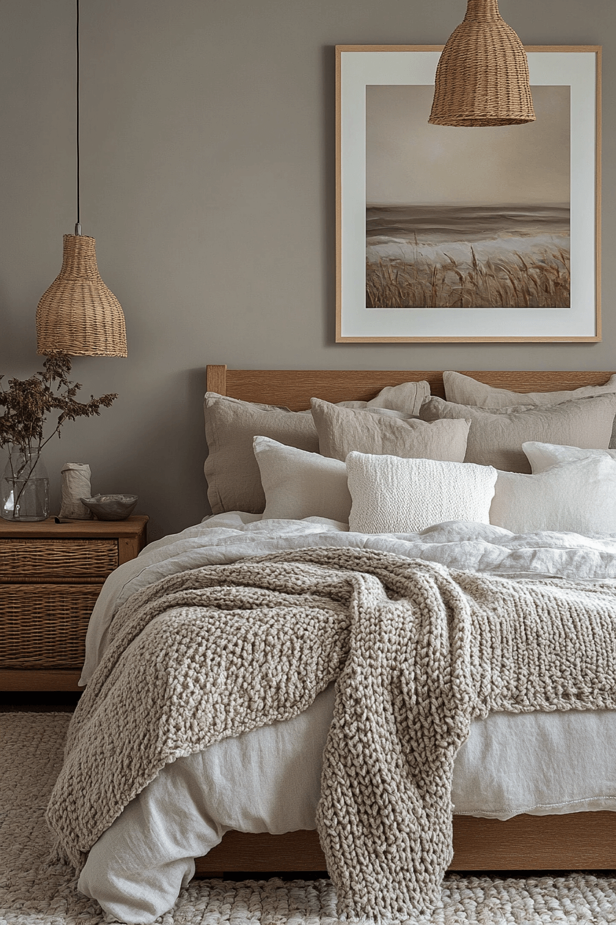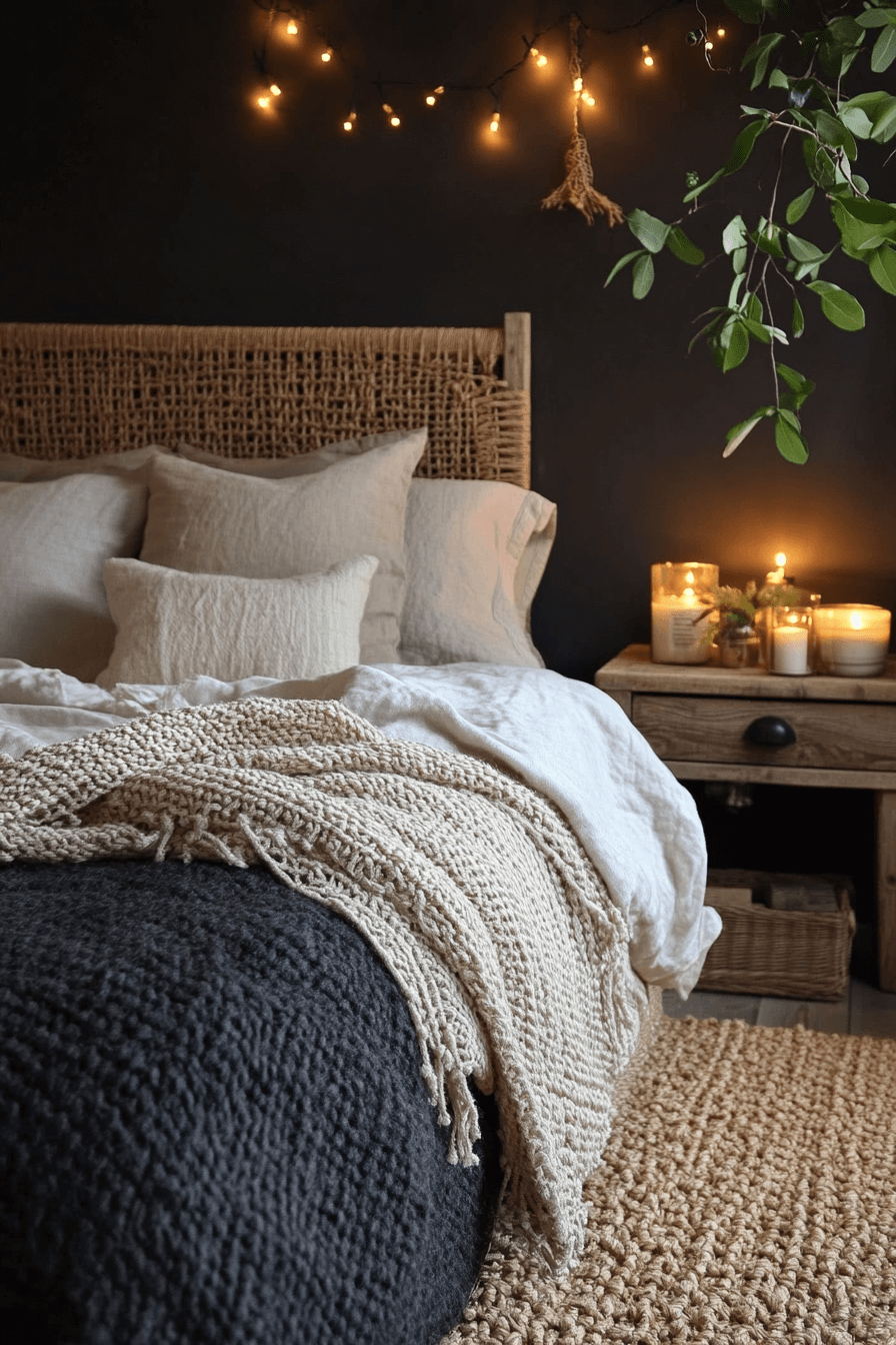 This cozy look shows how deep tones can still feel warm and inviting. A dark grey bedroom layered with soft knits, plush rugs, and warm lighting creates instant comfort. Natural textures break up the darker palette beautifully. The atmosphere feels relaxed and welcoming. Perfect for unwinding at the end of the day.