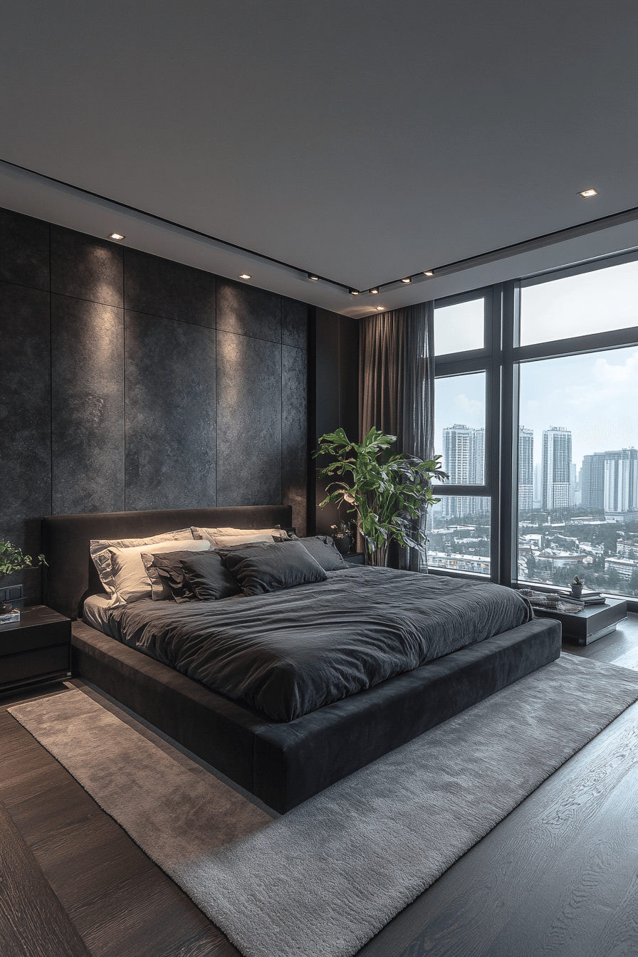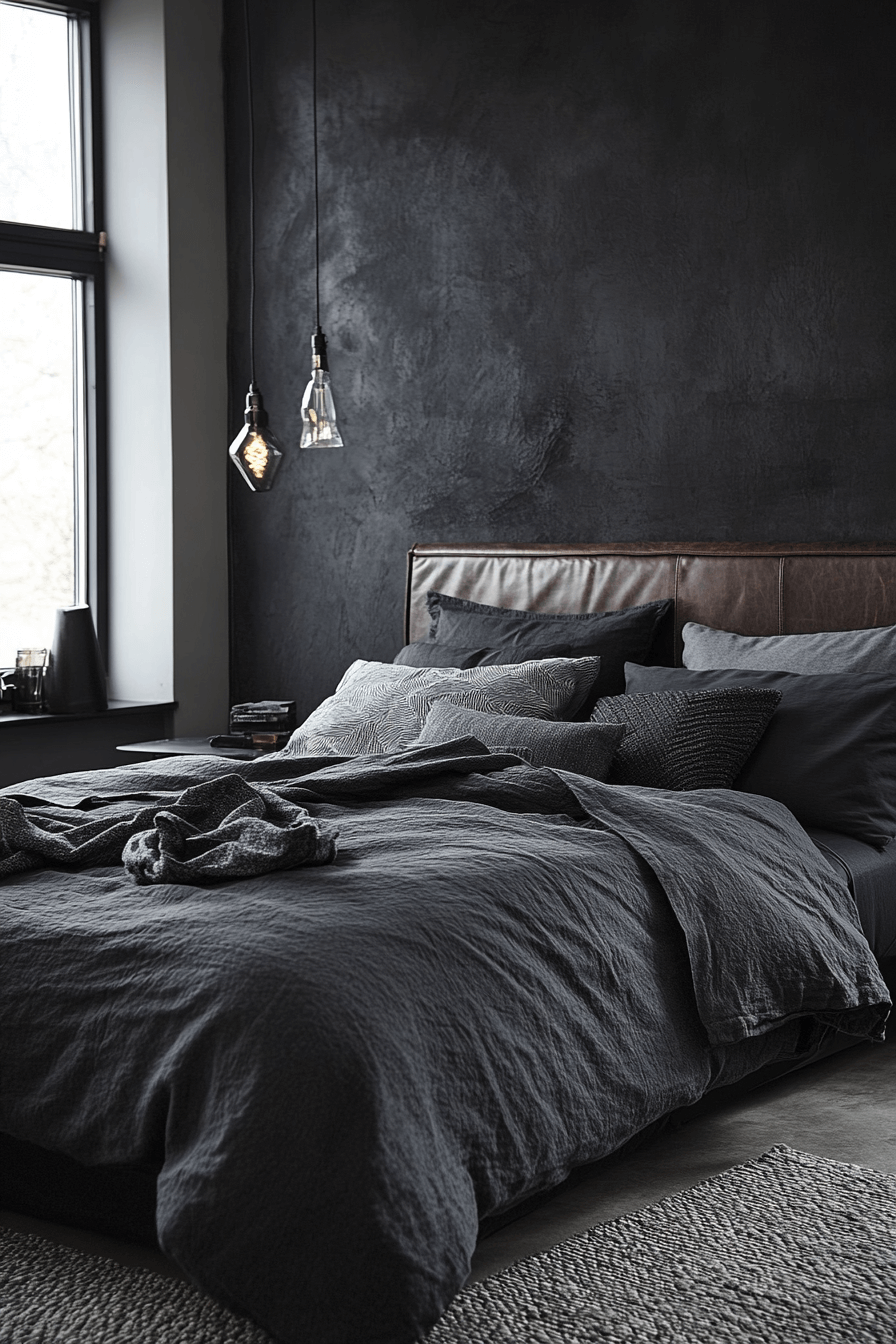 Bold contrast defines this striking bedroom look. A dark grey bedroom paired with matte black creates instant drama. Minimal decor allows the palette to shine. Metallic accents add subtle luxury. The style feels confident and sleek.