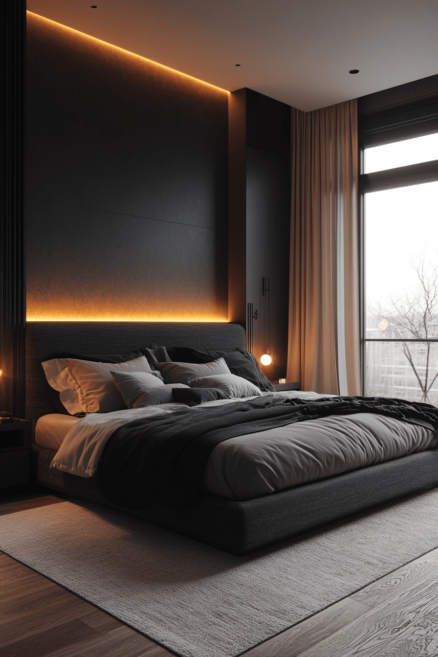 Scandinavian influence brings calm simplicity to this design. A dark grey bedroom pairs clean lines with soft textures and warm wood. Layered lighting creates a gentle glow throughout the room. Functional decor keeps the look effortless. It’s peaceful and practical.