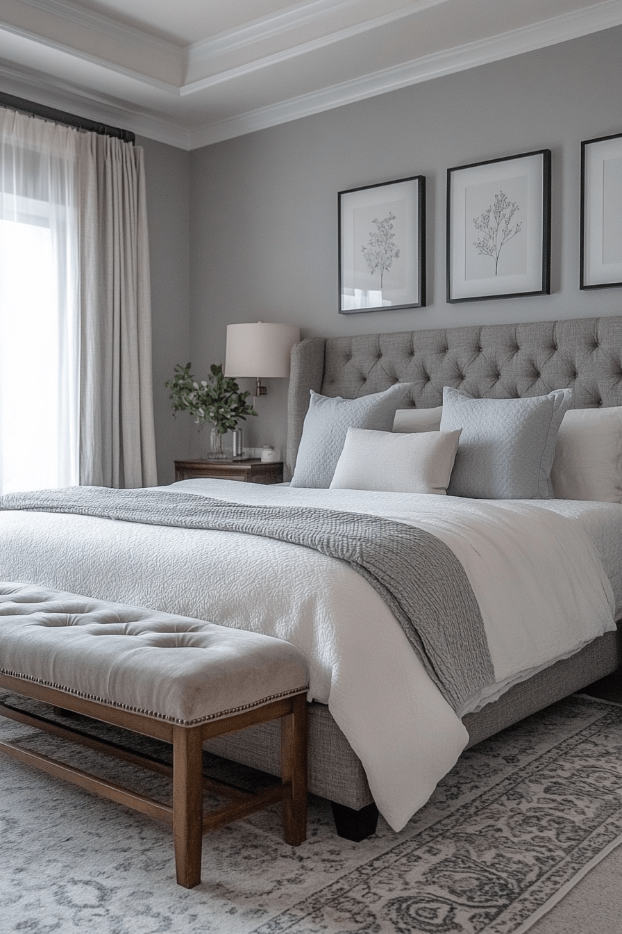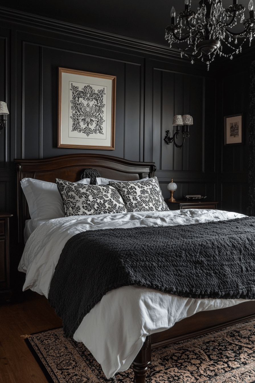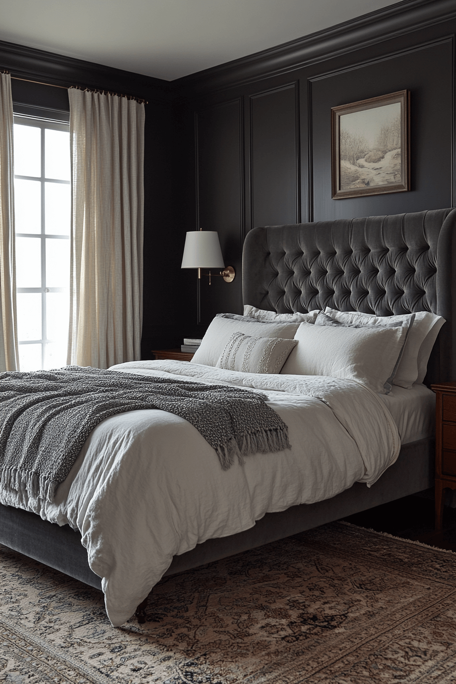 This bold design embraces contrast and texture for impact. A dark grey bedroom becomes dramatic with dark wood furniture and statement decor. Lighter accents prevent the space from feeling heavy. Plush layers add comfort and depth. The result is daring yet livable.