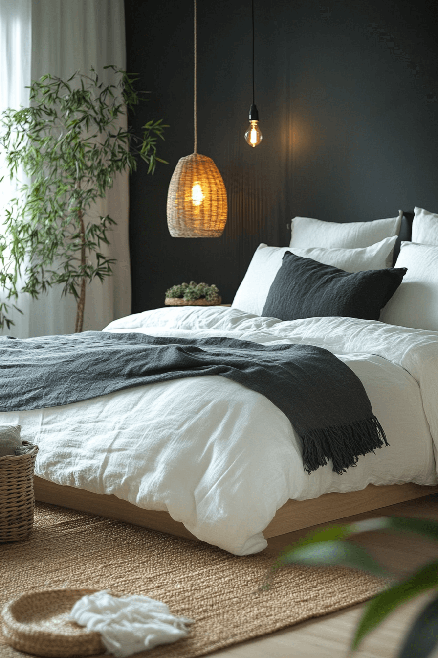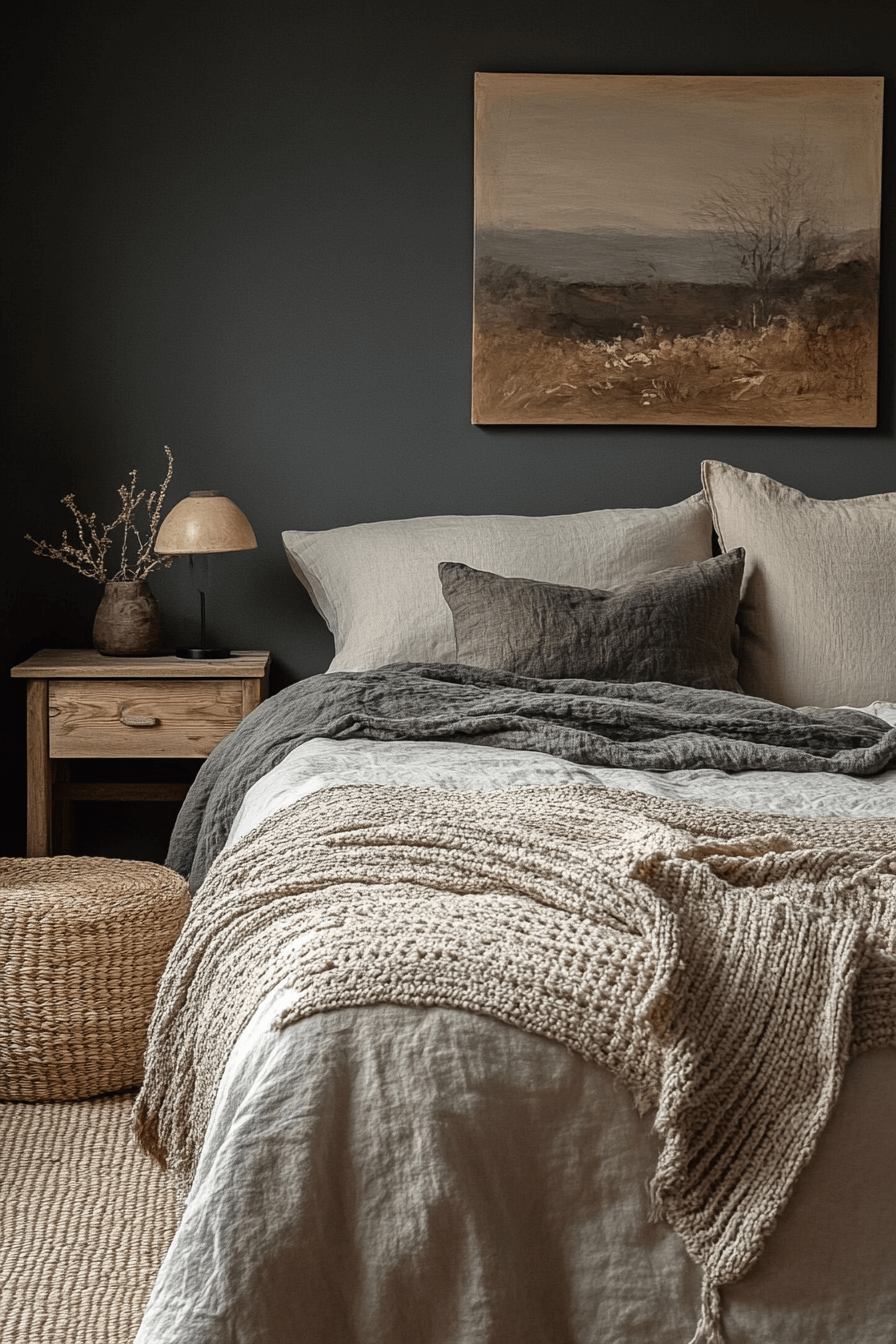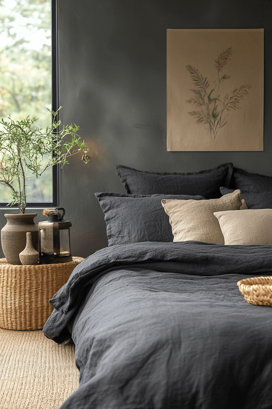 Natural accents bring life to this moody palette. A dark grey bedroom becomes inviting with earthy colors and organic textures. Wood, clay, and linen soften the depth of grey. The balance feels grounded and fresh. It’s nature-inspired calm.