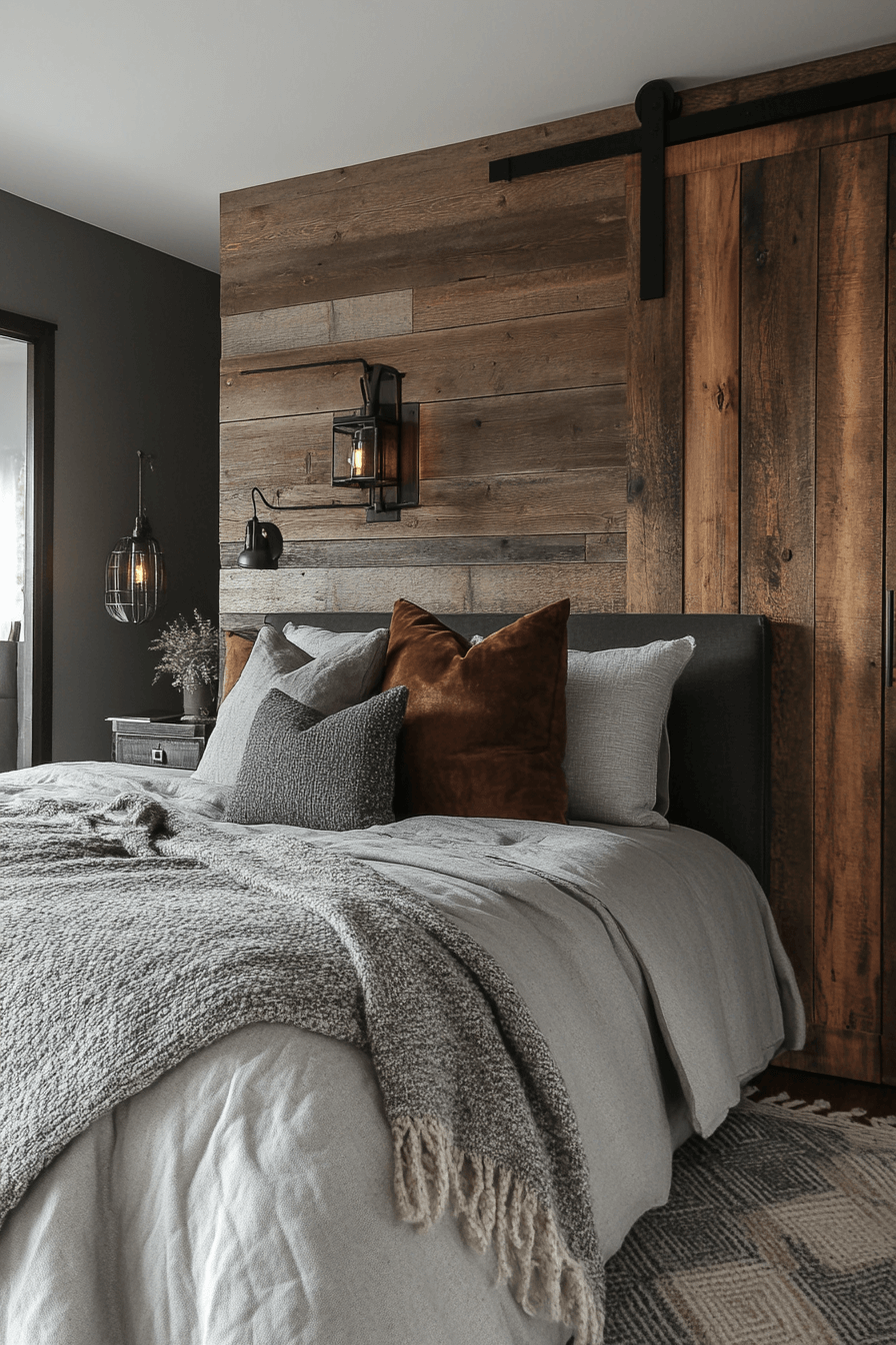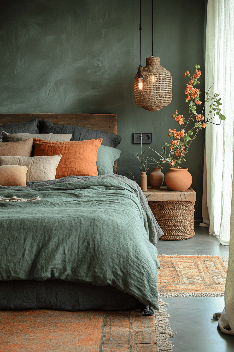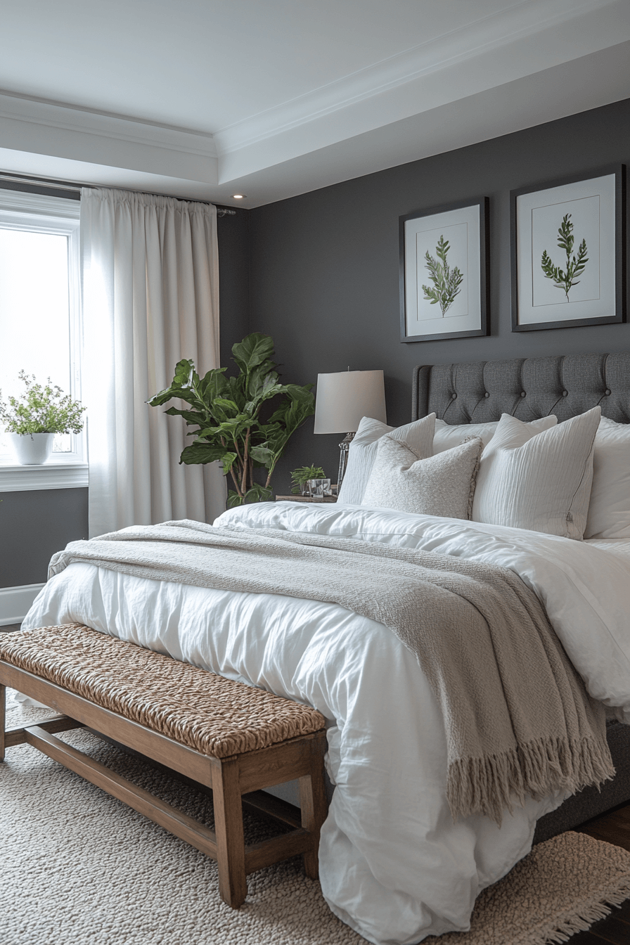 Natural accents bring life to this moody palette. A dark grey bedroom becomes inviting with earthy colors and organic textures. Wood, clay, and linen soften the depth of grey. The balance feels grounded and fresh. It’s nature-inspired calm.