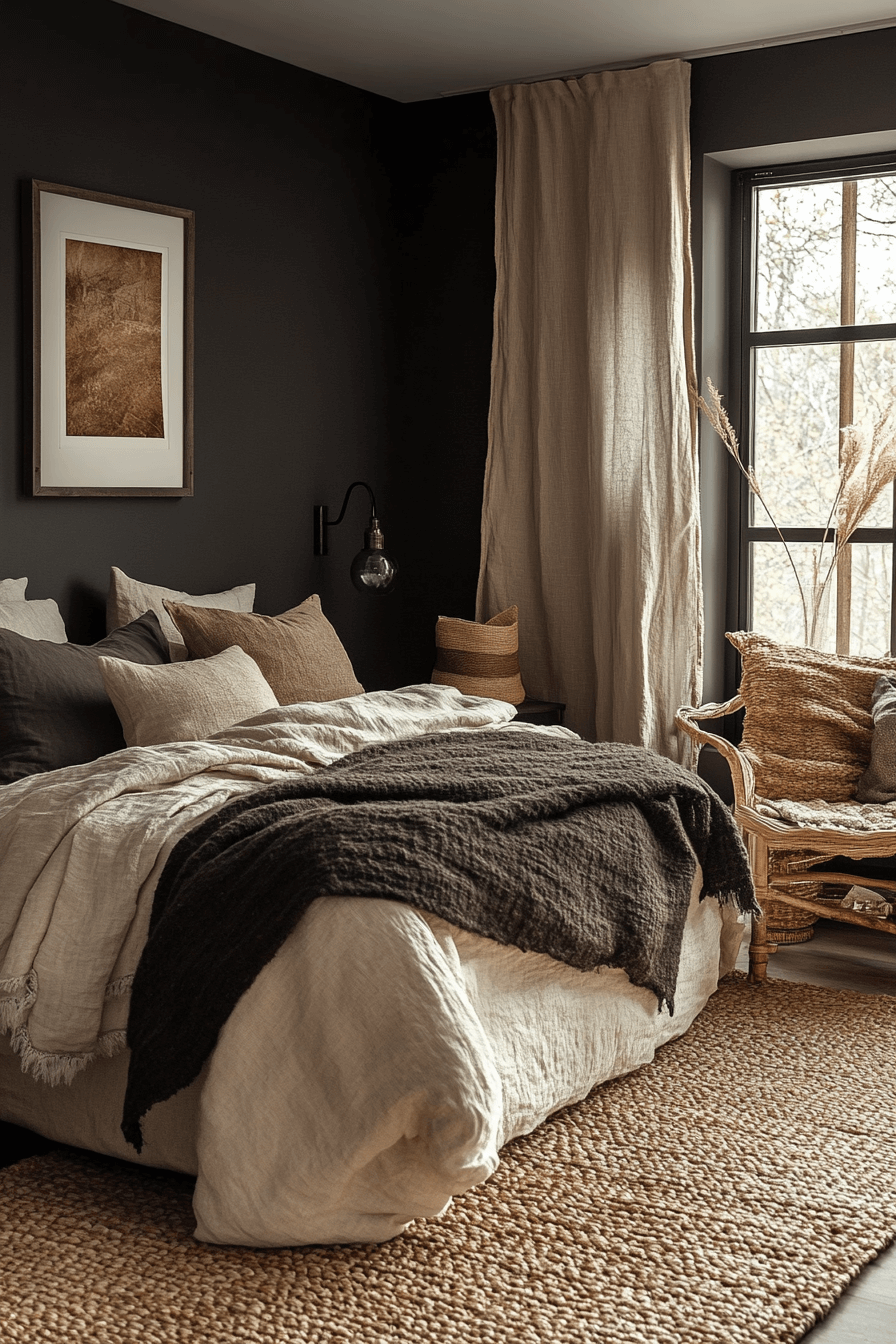 Deep neutrals create a grounded and timeless atmosphere. A dark grey bedroom blends seamlessly with warm browns and soft blacks. Natural textures add visual interest and warmth. The look feels balanced and adaptable. Perfect for long-term style.