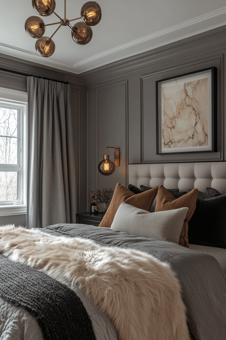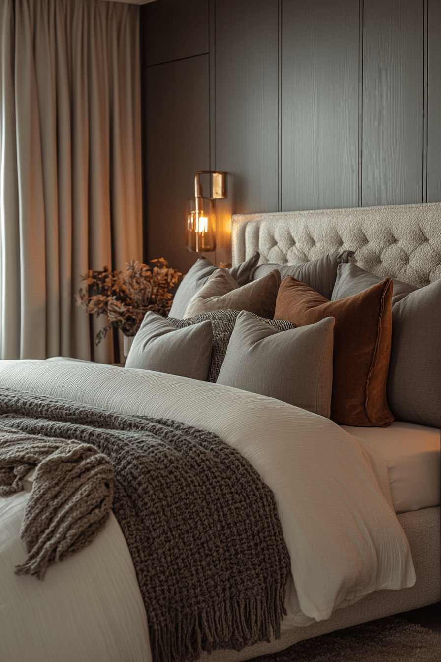 Warm undertones transform this space into an inviting escape. A dark grey bedroom becomes more approachable with taupe accents, soft lighting, and cozy textiles. Natural materials add warmth without losing sophistication. The room feels grounded and comforting. It’s perfect for relaxed evenings.