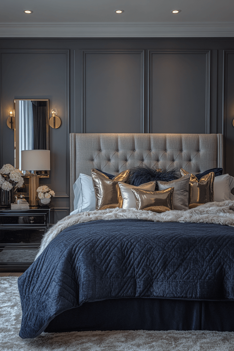High contrast and thoughtful lighting bring energy to this dramatic design. A dark grey bedroom paired with warm metallic finishes creates a subtle glow that feels both bold and elegant. Mirrors and glossy accents reflect light against matte walls for depth. Rich fabrics add softness without overpowering the look.