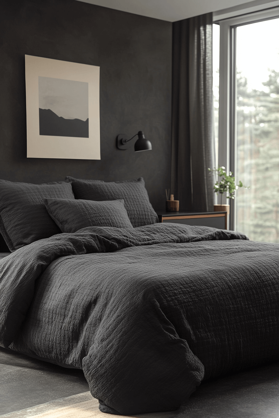 Light-filled design keeps this space airy and calm. A dark grey bedroom balances richness with openness through soft fabrics and natural light. Pale accents brighten the mood effortlessly. The contrast feels peaceful and refined. It’s calm without compromise.