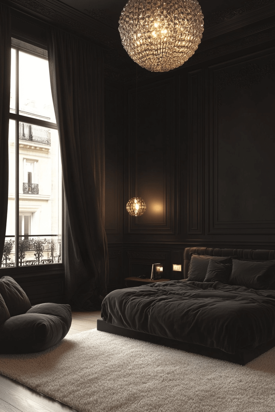 This design proves dark tones can feel vibrant and stylish. A dark grey bedroom stands out with sculptural furniture and glossy accents. Texture keeps the palette exciting and dynamic. Statement lighting completes the look. It’s fashion-forward and bold.