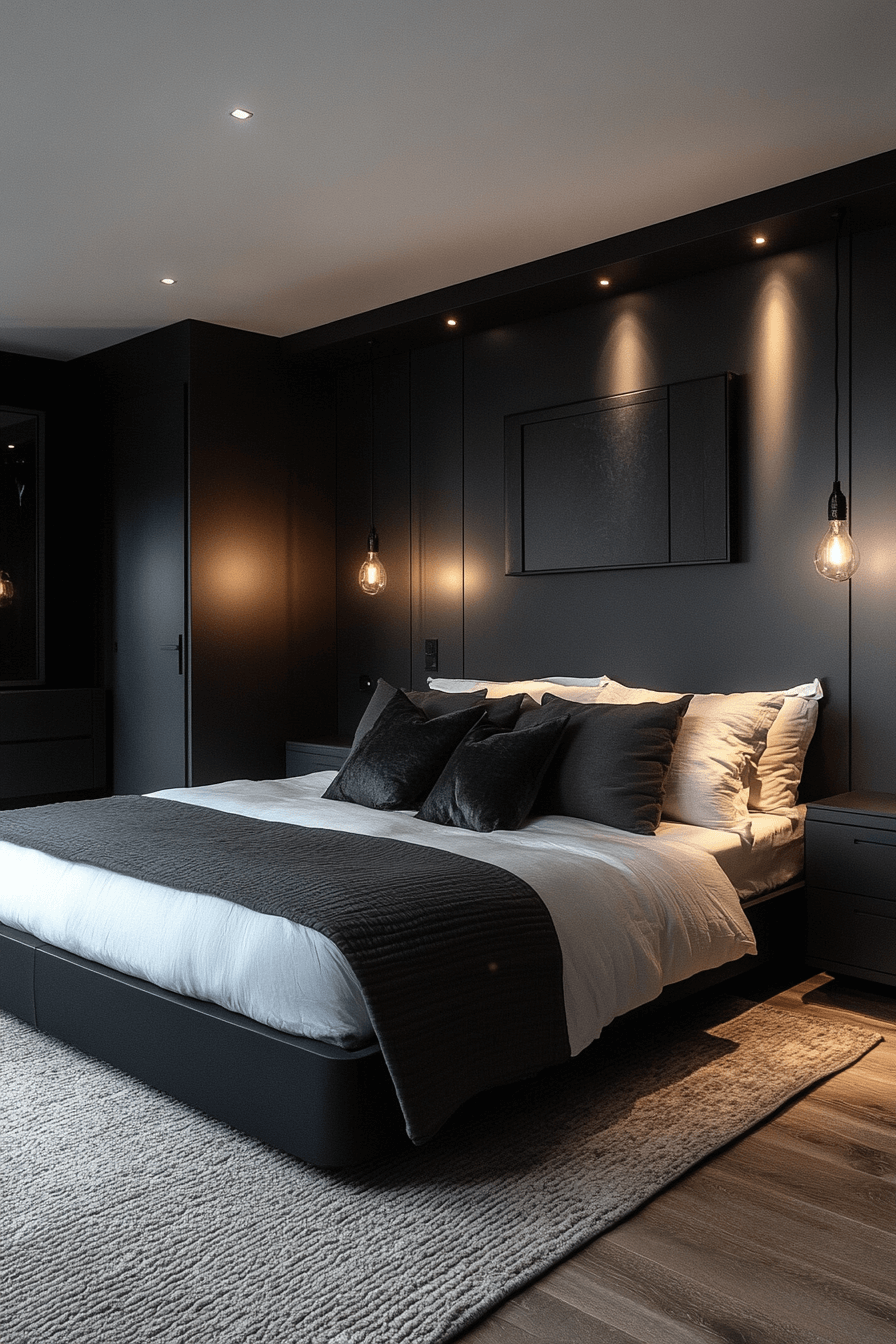 Bold contrast defines this striking bedroom look. A dark grey bedroom paired with matte black creates instant drama. Minimal decor allows the palette to shine. Metallic accents add subtle luxury. The style feels confident and sleek.