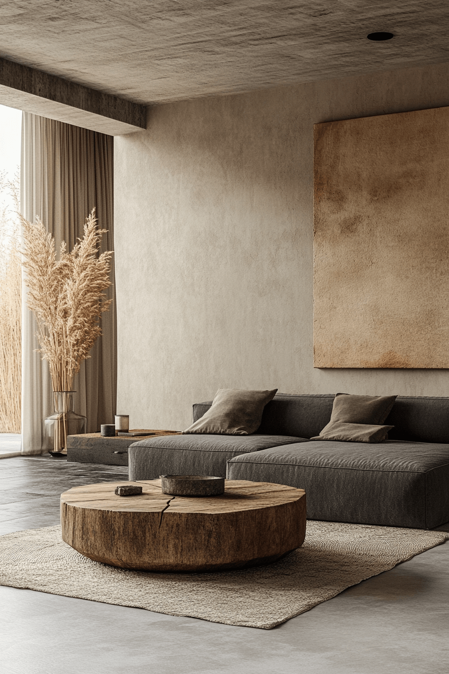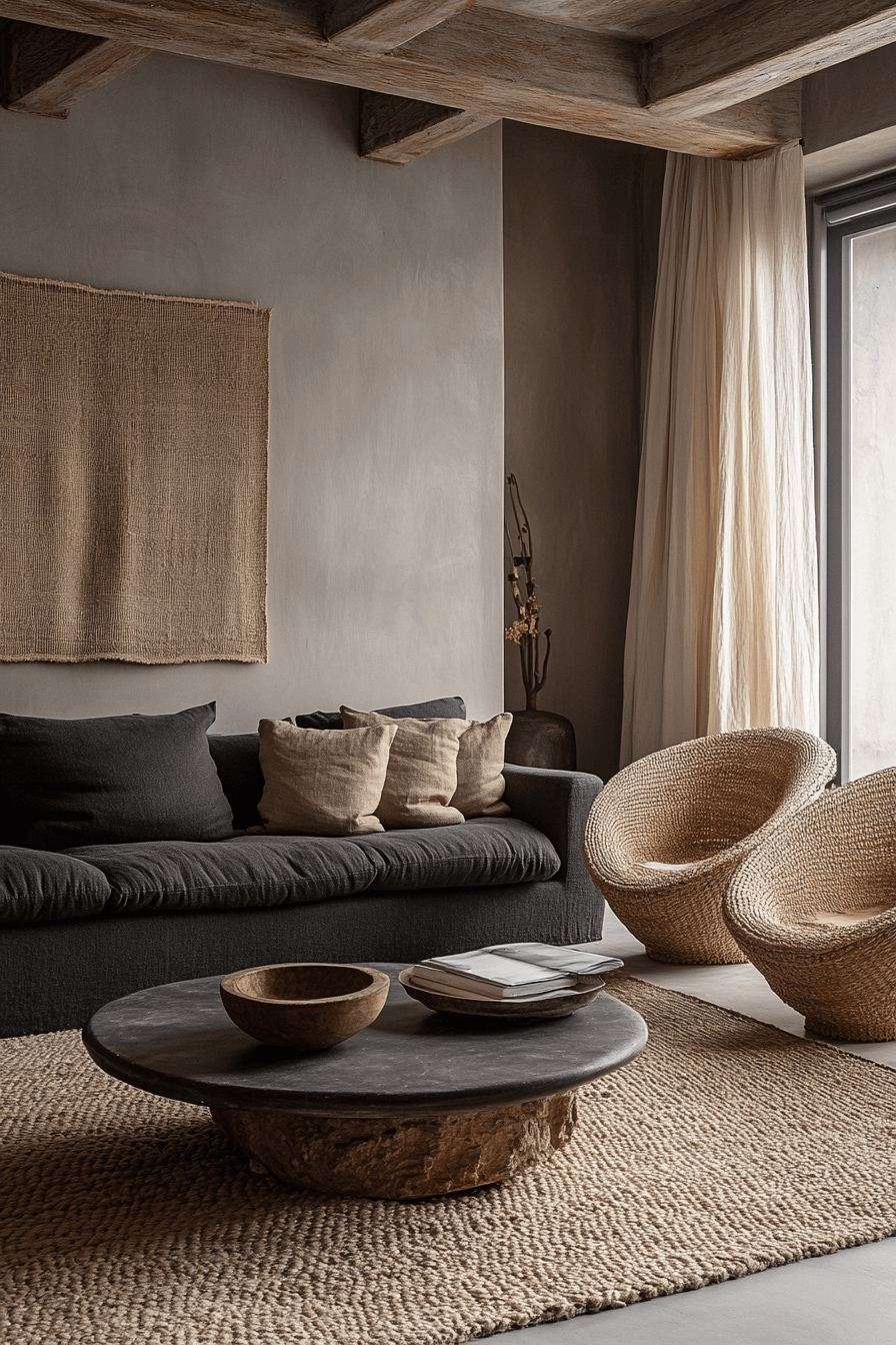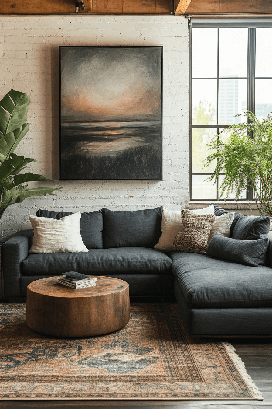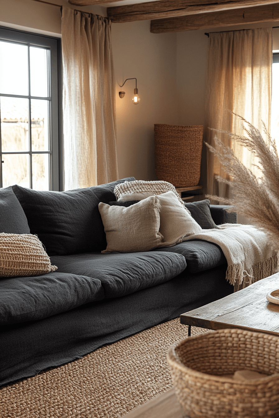 Rustic elements blend effortlessly with modern styling inside a dark grey couch living room that balances warmth and edge. Reclaimed wood, cozy textiles, and soft neutrals soften the bold seating choice. Contrast keeps the look fresh rather than traditional. Comfort and character coexist naturally. The space feels inviting without losing its modern appeal.