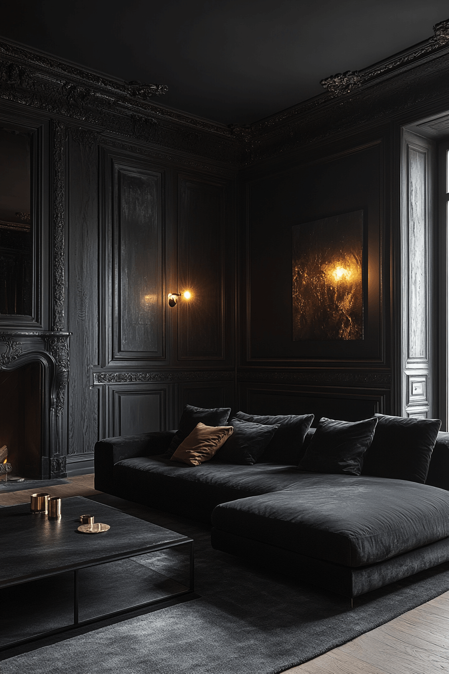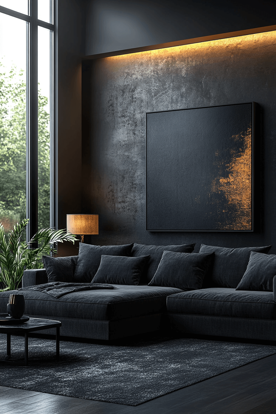Moody modern design feels elevated when strong contrast and intentional styling shape a dark grey couch living room with visual confidence. Deep charcoal seating anchors bold artwork and sculptural lighting without overpowering the space. Matte finishes and textured rugs add richness while keeping the room grounded. Every design choice contributes to a sense of balance and clarity. Dramatic elements feel refined rather than overwhelming.