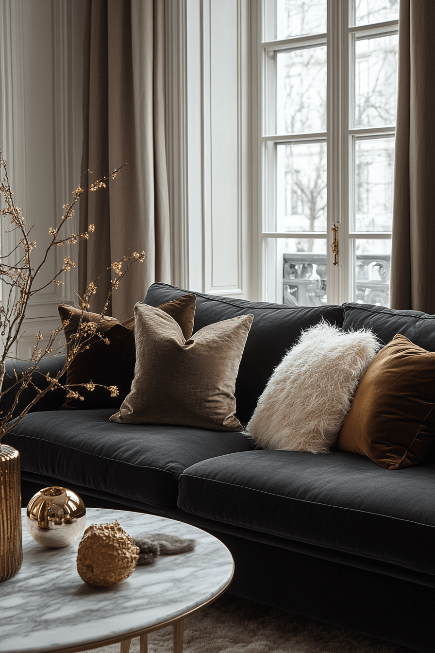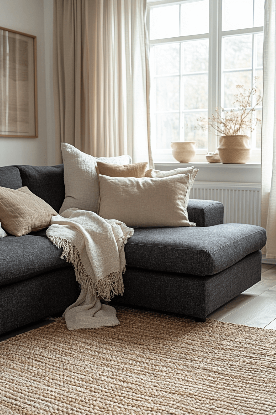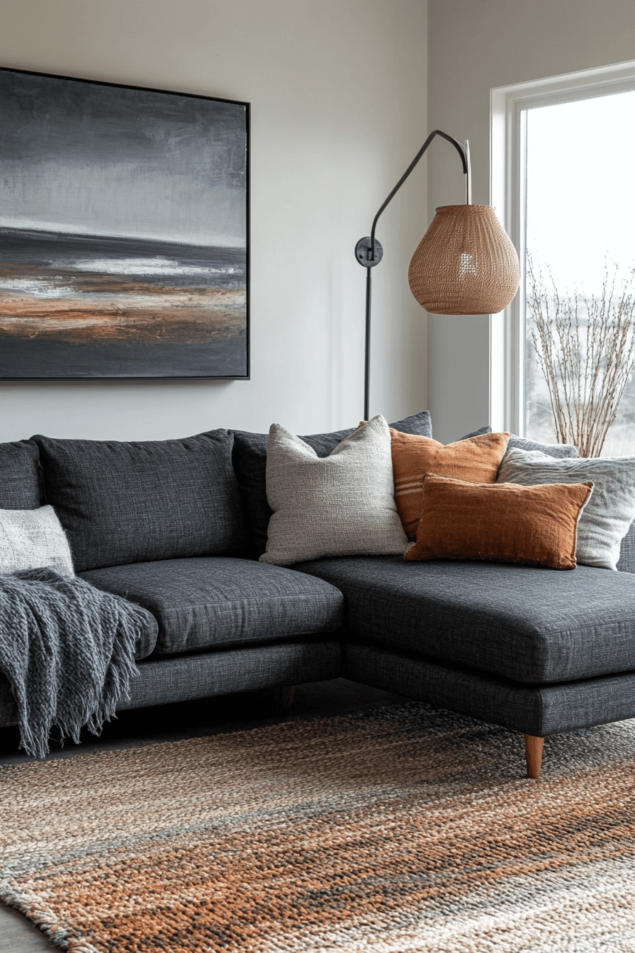 Tactile richness transforms a dark grey couch living room into a layered and inviting environment. Materials like wool, linen, velvet, and leather soften the sofa’s darker tone. Sensory contrast adds warmth and visual interest. The room feels comfortable while remaining stylish. Thoughtful layering enhances depth without clutter.